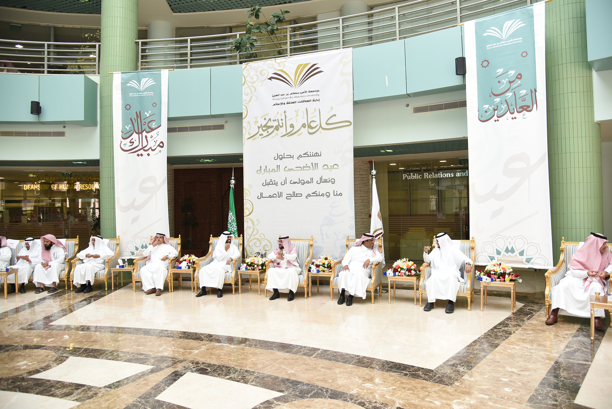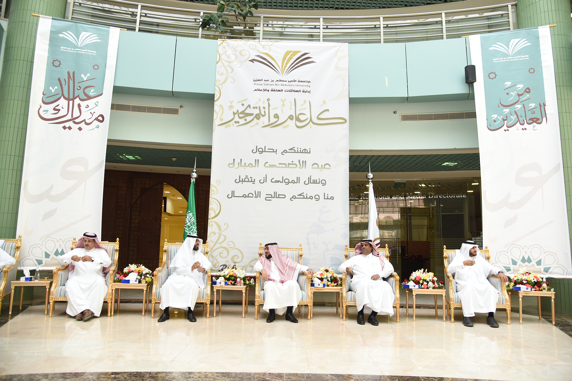 أقامت جامعة الأمير سطام بن عبدالعزيز بمبنى الإدارة بالمدينة الجامعية بالخرج صباح يوم الأحد السابع عشر من شهر ذي الحجة احتفالاً بعيد الأضحى المبارك برعاية معالي مدير الجامعة الأستاذ الدكتور عبد العزيز بن عبد الله الحامد وحضور وكلاء الجامعة وعمداء الكليات والعمادات المساندة ، بالإضافة إلى عدد كبير من أعضاء هيئة التدريس والموظفين , حيث قدم معالي مدير الجامعة تهنئته لمقام خادم الحرمين الشريفين الملك سلمان بن عبدالعزيز ولولي عهده سموّ الأمير محمد بن سلمان بمناسبة عيد الأضحى المبارك , مباركًا لهم نجاح موسم حج هذا العام 1440هـ , والذي تكلل بأداء المسلمين لشعريتهم بكل يسر وسهولة وأمان واطمئنان؛ مؤكدًا أن نجاح هذا الموسم فخر لكل السعوديين، متمنيًّا للحجاج قبول حجهم، وأن يديم على بلادنا الأمن والأمان .