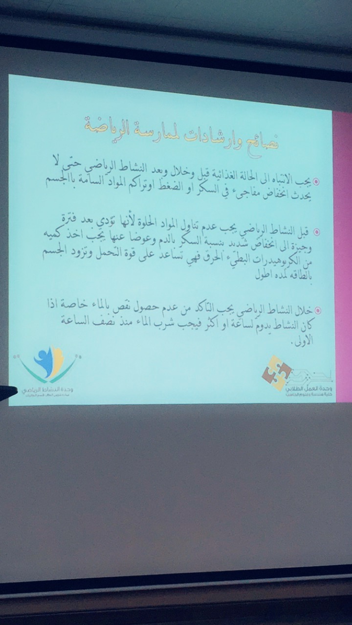 و من ثم تم استضافة طبيبة الكلية/ د. شدوى الحناوي لالقاء ندوة بعنوان ( الرياضة صحة و حياة ) تكلمت فيها عن أهمية الأنشطة الرياضية و تفعيلها في حياتنا اليومية وقدمت نصائح و ارشادات لممارسة الرياضة و دور الرياضة بصحة الانسان .