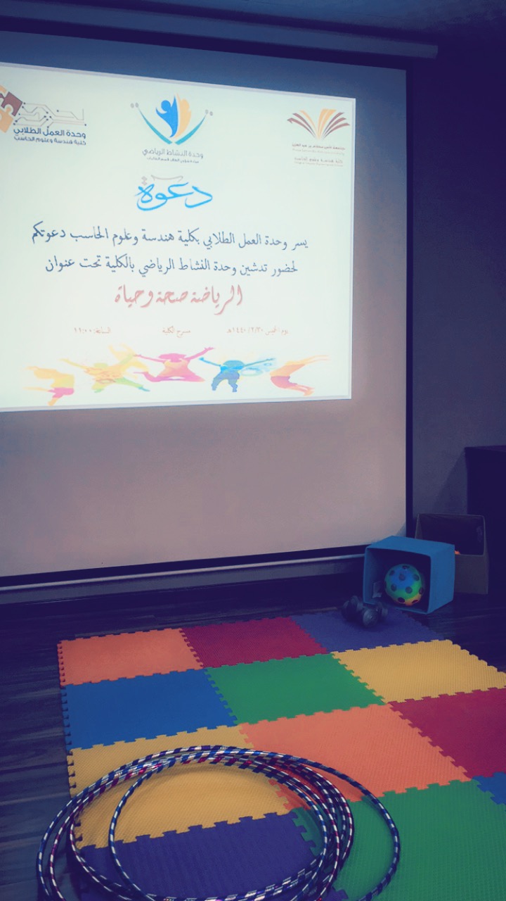 نظمت وحدة العمل الطلابي حفل تدشين النشاط الرياضي بكلية هندسة وعلوم الحاسب شطر الطالبات يوم الخميس 30 صفر 1440 هـ الموافق 8 نوفمبر 2018 م في مسرح الكلية وذلك بحضور مديرة الإدارة الاستاذة الهنوف الشغرود نيابة عن وكيلة الكلية و عدد من أعضاء هيئة التدريس والموظفات وطالبات الكلية.