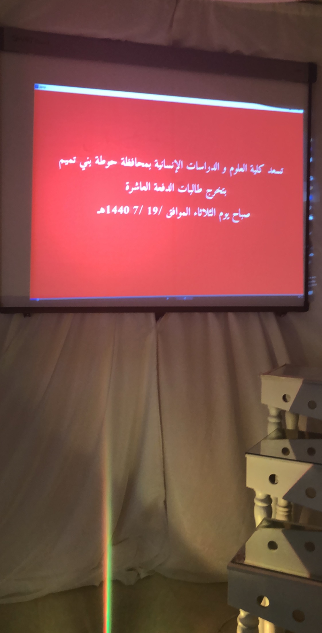 نظمت كلية العلوم والدراسات الانسانية بحوطة بني تميم حفل تخريج الدفعة العاشرة مرحلة البكالوريوس من طالبات الكلية في يوم الثلاثاء 18 / ٧ / 1440 هـ بمركز الأنشطة الطلابية بالمحافظة تحت رعاية سعادة عميدة الكلية الدكتورة حصة الهزاني وبحضور قيادات الكلية الدكتورة مي مصطفى ووكيلة الكلية للشؤون الادارية والمالية الأستاذة تهاني الجويعد ووكيلة الجودة الأستاذة فاطمة الكليب ورئيسات الأقسام وعدد كبير من أعضاء هيئة التدريس والطاقم الاداري وأمهات الخريجات.