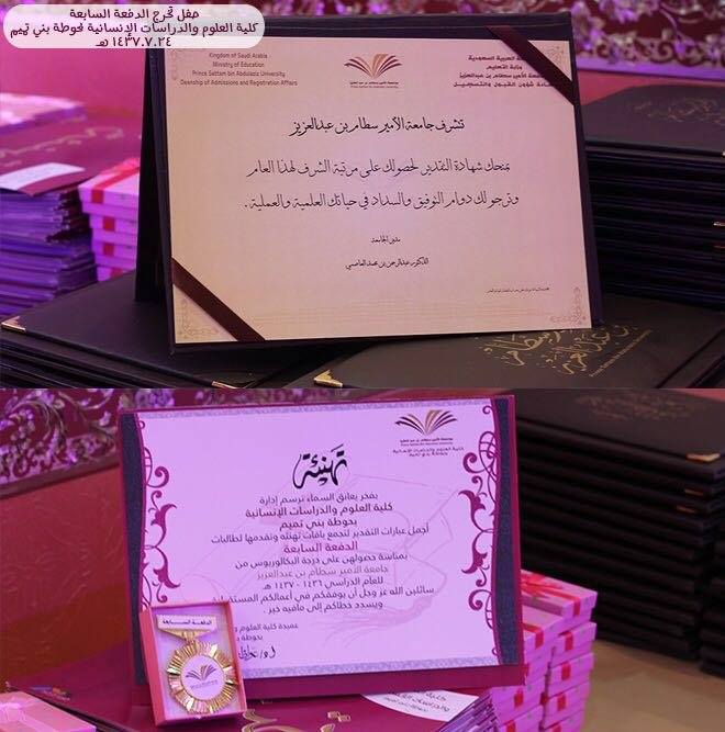 بعد ذلك أُلقِيت كلمة الخريجات ألقتها بالنيابة عنهن الخريجة : منيره سعود بن ضويان ، ثم بدأت عميدة الكلية ووكيلة الكلية د.حصة الهزاني و رئيسة القبول والتسجيل بجامعة سطام أ. هدى راشد الجليفي بتتويج الطالبات الحاصلات على مرتبة الشرف الأولى ،وبعد ذلك تم تتويج جميع خريجات الأقسام ، وفي الختام تم تقديم الشكر وتقديم دروعًا تذكريه للرعاة الداعمين لهذا الحفل مؤسسة هادئ بن حسن الدوسري ومركز أحلى بنوته وأسواق آل موسى المركزية وكانت منسقة الحفل أ . سارة التميمي وإعداد القاعة أ . عبد الرحمن الزيد