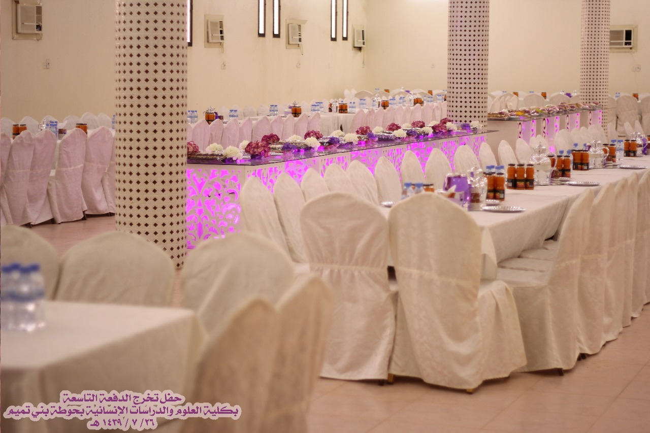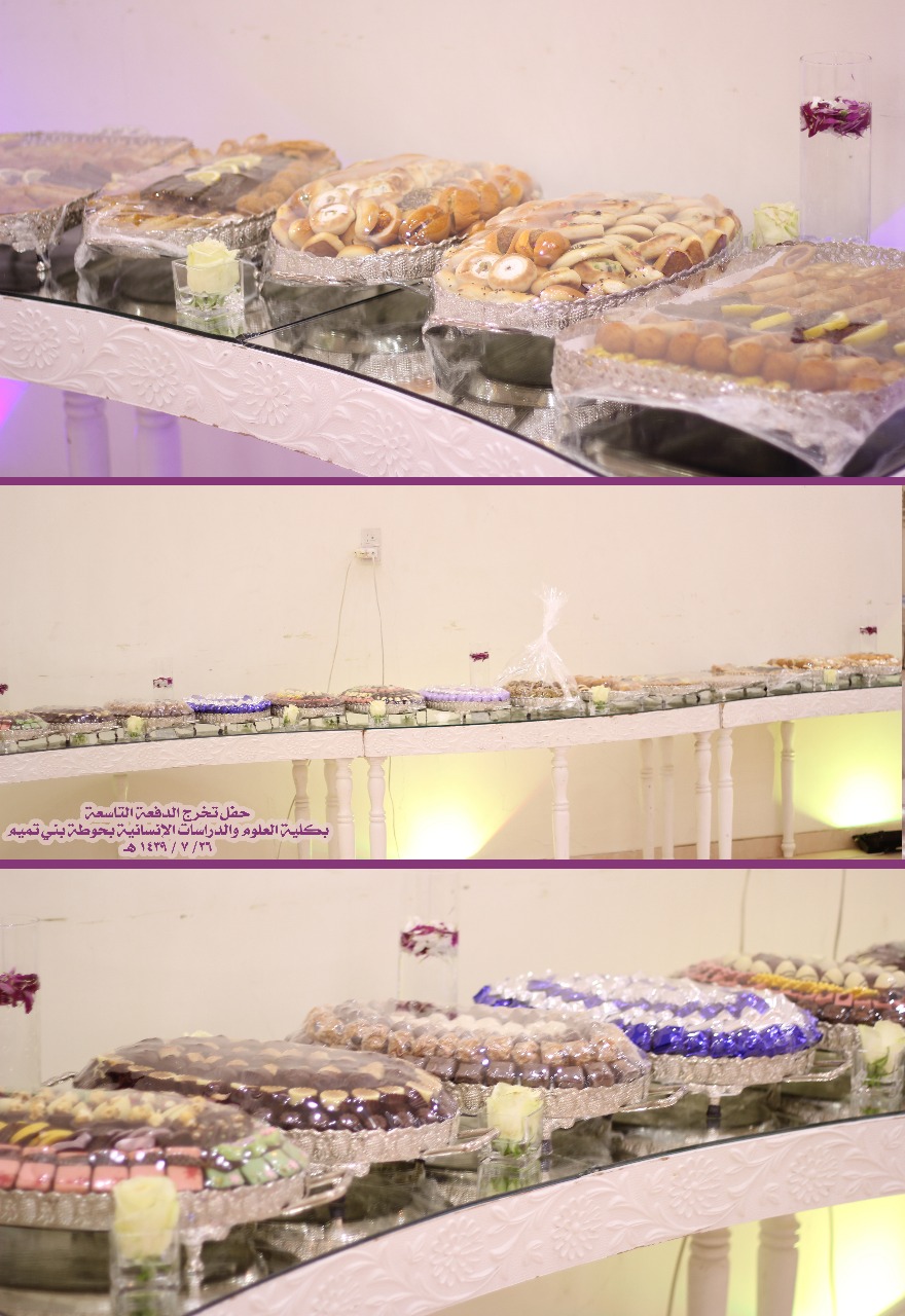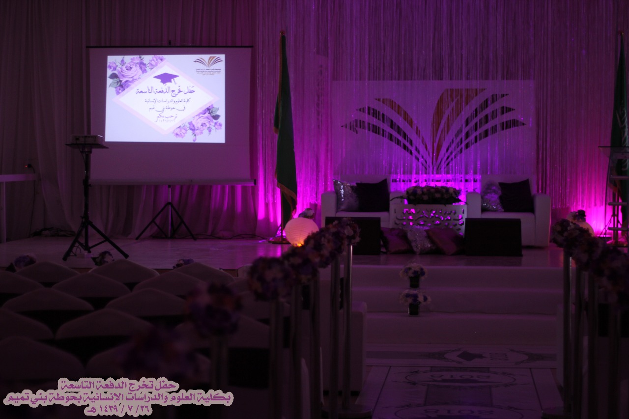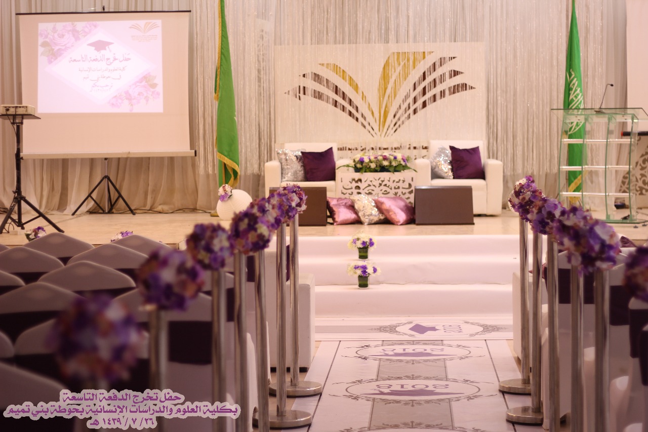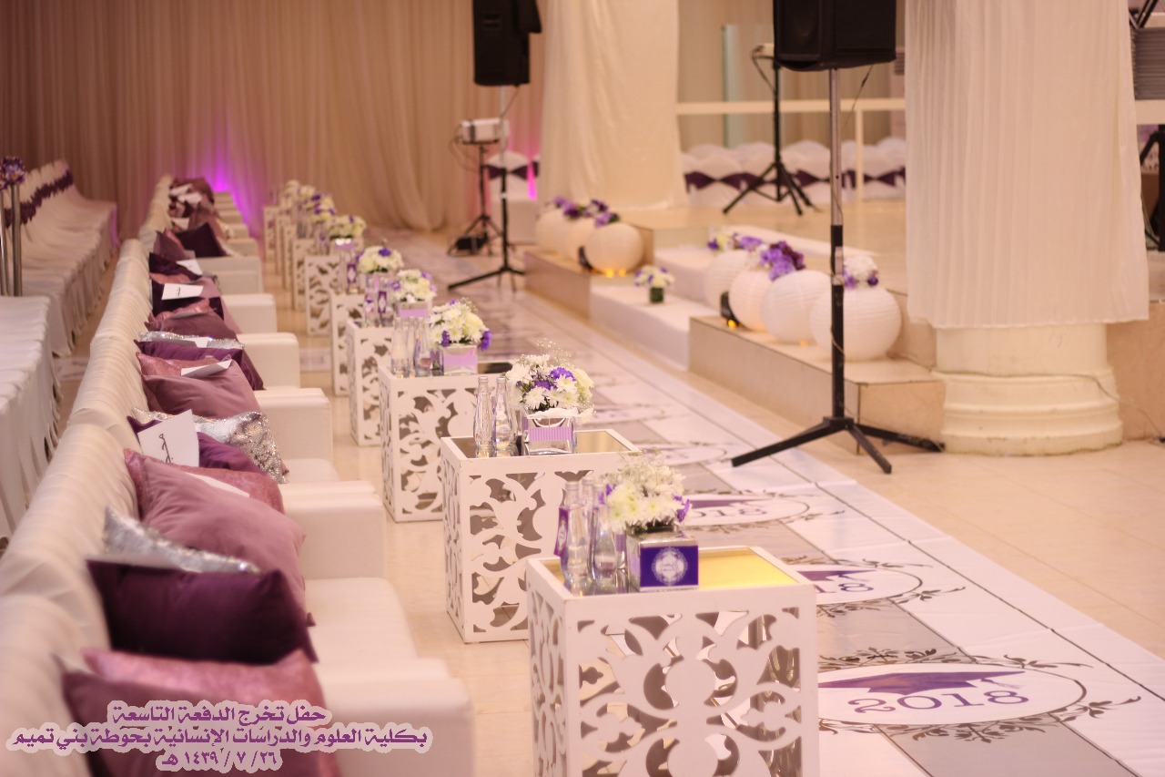 نظمت كلية العلوم والدراسات الإنسانية بحوطة بني تميم حفل تخريج الدفعة التاسعة مرحلة البكالوريوس من طالبات الكلية في يوم الخميس ٢٦ / ٧ / ١٤٣٩ هـ تحت رعاية سعادة عميدة الكلية الدكتورة حصة الهزاني وبحضور سعادة الدكتورة نوف التميمي والدكتورة ريم العلي والدكتورة نورة العلي والدكتورة أنوار الرشيدي وقيادات الكلية مساعدة العميدة للشؤون التعليمية والأكاديمية الدكتورة مي مصطفى ووكيلة الكلية للشؤون الادارية والمالية الأستاذة تهاني الجويعد ووكيلة الجودة الأستاذة فاطمة الكليب ورئيسات الأقسام وعدد كبير من أعضاء هيئة التدريس والطاقم الإداري وأمهات الخريجات.