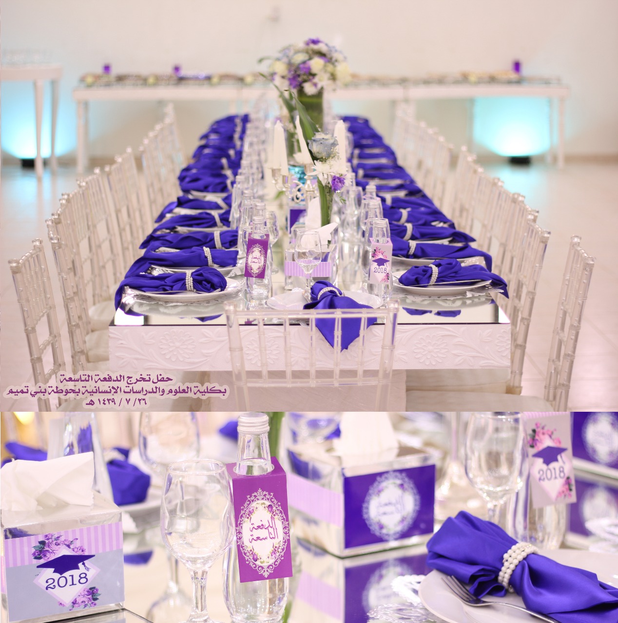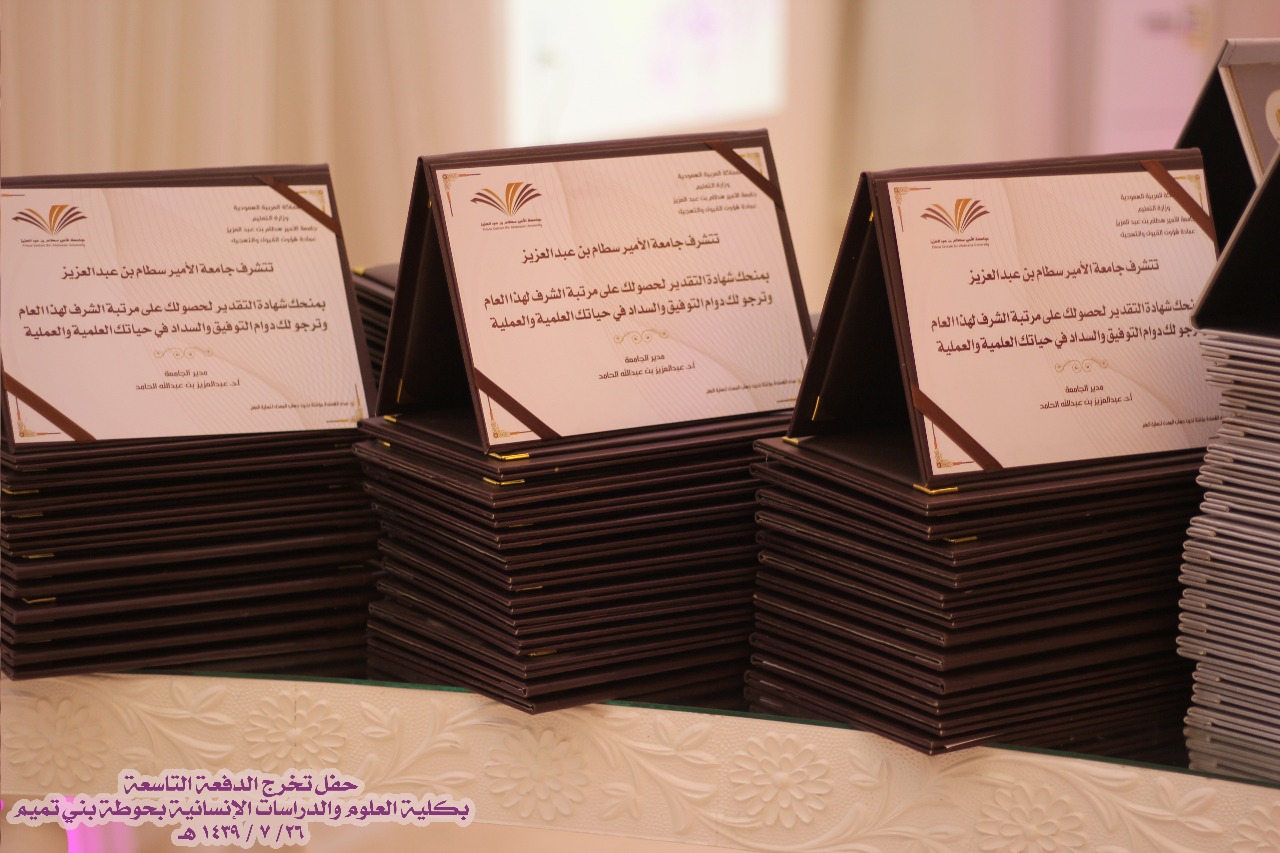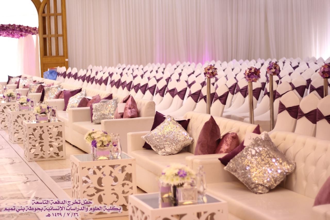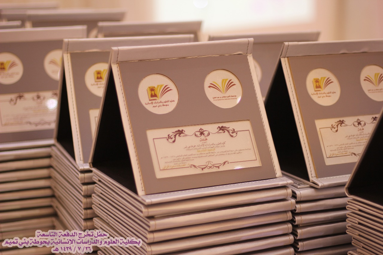 نظمت كلية العلوم والدراسات الإنسانية بحوطة بني تميم حفل تخريج الدفعة التاسعة مرحلة البكالوريوس من طالبات الكلية في يوم الخميس ٢٦ / ٧ / ١٤٣٩ هـ تحت رعاية سعادة عميدة الكلية الدكتورة حصة الهزاني وبحضور سعادة الدكتورة نوف التميمي والدكتورة ريم العلي والدكتورة نورة العلي والدكتورة أنوار الرشيدي وقيادات الكلية مساعدة العميدة للشؤون التعليمية والأكاديمية الدكتورة مي مصطفى ووكيلة الكلية للشؤون الادارية والمالية الأستاذة تهاني الجويعد ووكيلة الجودة الأستاذة فاطمة الكليب ورئيسات الأقسام وعدد كبير من أعضاء هيئة التدريس والطاقم الإداري وأمهات الخريجات.