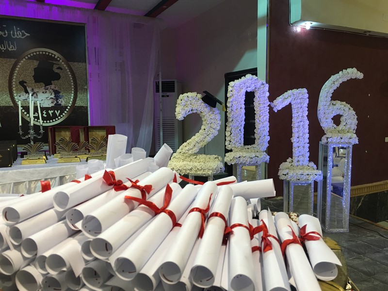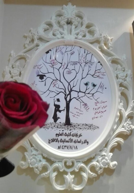 ليصل الحفل إلى أعلى درجات الإتقان كما مٌنحت كل خريجة عباءة التخرج وبطاقتان لها ولمرافقتها .