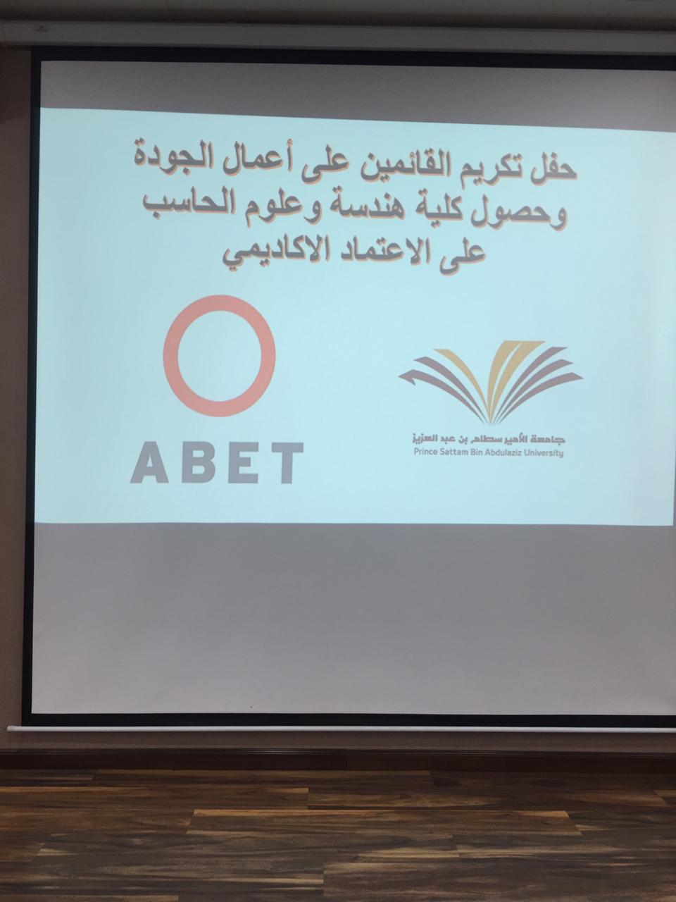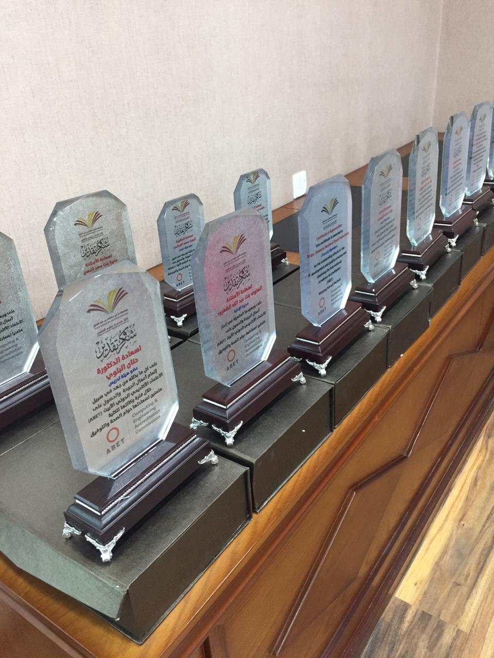 برعاية وكيلة الكلية الدكتورة / هيا بنت محمد العسكر ، اقامت وحدة العلاقت العامة بكلية هندسة و علوم الحاسب قسم الطالبات حفل تكريم القائمين على أعمال الجودة و تحضيرات زيارة فريق abet في العام الماضي و ذلك يوم الأحد الموافق 16/04/1440هـ الموافق 23 ديسمبر 2018م الساعة 10 صباحا وكان بإشراف مشرفة العلاقات العامة الاستاذة/ ليلى الرفدي و الاستاذة/ هدى الحديثي كرم فيه من شارك في اعمال الجودة من اعضاء هيئة التدريس و من موظفات الكلية شاكرين لهن على جهودهن المبذولة للاسهام في نجاح الكلية و تقدمها .