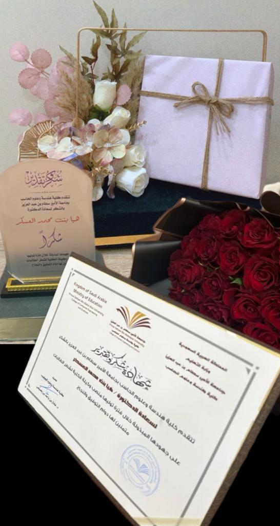 تحت رعاية وكيله كلية هندسه وعلوم الحاسب د. الهام بنت داود كريري أقامت الكلية حفل تكريم للدكتورة / هيا بنت محمد العسكر وكيلة الكلية سابقا وتهنئتها على تكليفها وكيلة لعمادة الدراسات العليا بالجامعة و تكريم الأستاذة/ ايمان الدوسري مديرة فرع إدارة الكلية لشطر الطالبات سابقا وذلك في يوم الاثنين 25/8/1443هـ بمسرح الكلية .