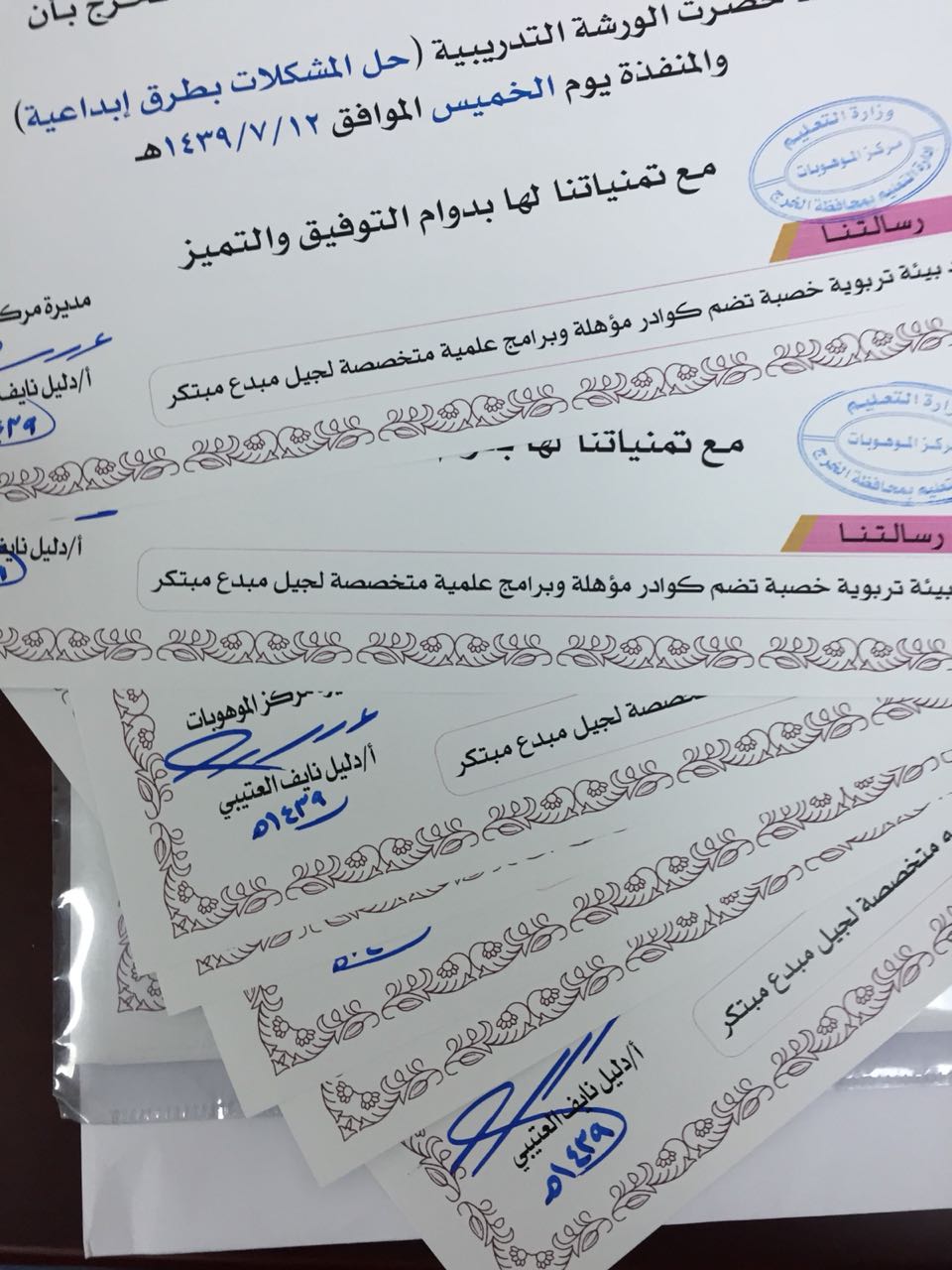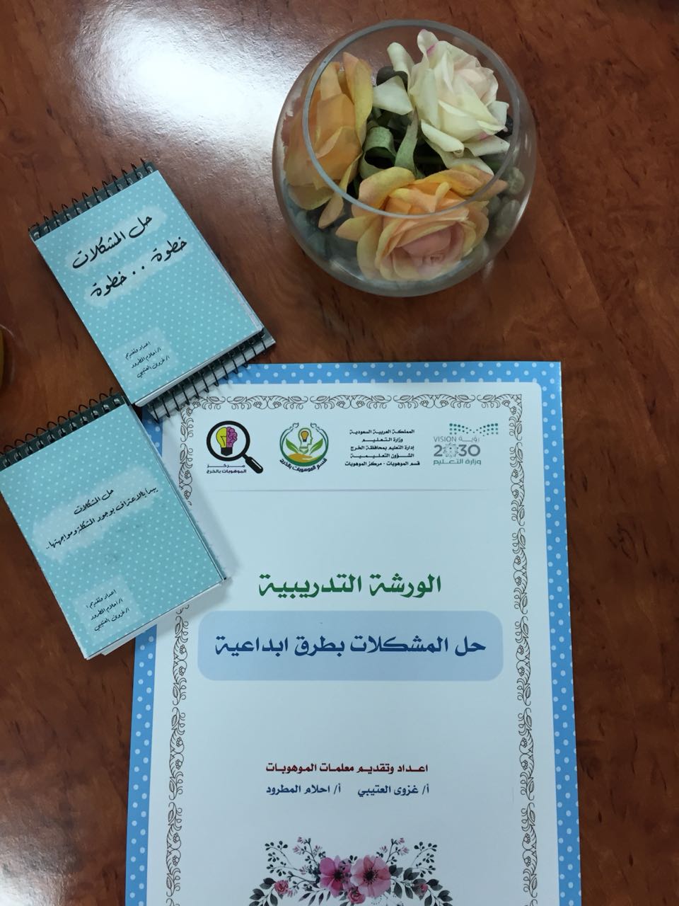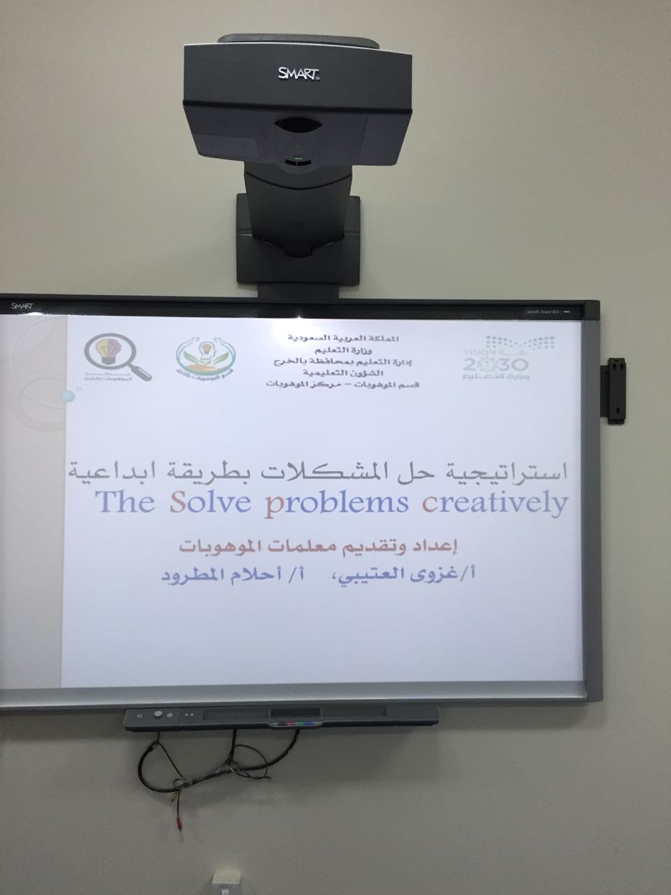 وتم بعد ذلك مناقشة خطوات استراتيجية حل المشكلات الابداعية بدءاً بالإحساس بالمشكلة وإنتهاء بحلها بطريقه إبداعية .واختتم اللقاء بعرض فيديو يحاكي خطوات حل المشكلات وتم توزيع شهادات شكر للمدربات والطالبات المشاركات من قبل الأستاذة منيرة السبيعي مشرفة وحدة الموهوبات .