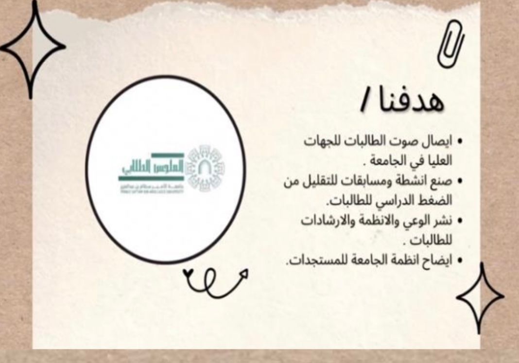 .ويهدف هذا اللقاء إلى تعريف الطالبات بعضوات المجلس الطلابي وأبرز أهداف المجلس الطلابي وآلية التعاون بين الطالبات والعضوات ومناقشة قضاياهن ومقترحاتهن، وقد تم عقد اللقاء بشكل ودي بالكافتيريا لضمان الوصول إلى أكبر عدد من الطالبات، وقد حضر اللقاء عدداً من الطالبات وحظي على استحسانهن.