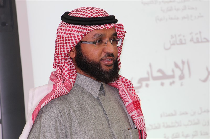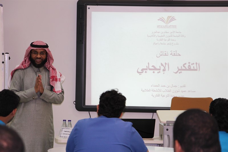 تحت رعاية عميد الكلية الدكتور/ حمدان بن علي الشهري أقامت وحدة التوعية الفكرية ضمن مشروع (نحو جامعة واعية-1) حلقة نقاش بعنوان ( التفكير الإيجابي) ألقاها سعادة الأستاذ / جمال بن حمد الحمداء مساعد عميد شؤون الطلاب للأنشطة الطلابية , وبدأ المدرب حلقة النقاش بتعريف مصطلح الفكر وماهو التفكير الإيجابي وتطرق لسبب كثرة الحديث عن التفكير الإيجابي وأنه من منطلق أن النبي صلى الله عليه وسلم " كان يعجبه الفأل", وختم المحاضر حلقة النقاش بذكر الوسائل المعينة على التفكير الإيجابي.