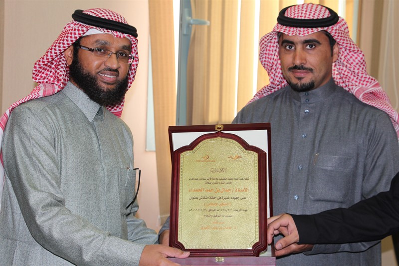 وقد تم تقسيم الطلبة المشاركين إلى مجموعات صغيرة, وتخللها الإجابة على أسئلتهم. وفي نهاية الدورة كرم مدير الإدارة الأستاذ/ ماجد بن فويز الدوسري سعادة الأستاذ / جمال الحمداء متمنياً له دوام التوفيق وشاكراً ومقدراً مشاركته الفاعلة في انجاز مشروع " نحو جامعة واعية " والذي تشرف عليه وكالة الجامعة للشؤون التعليمية والأكاديمية .