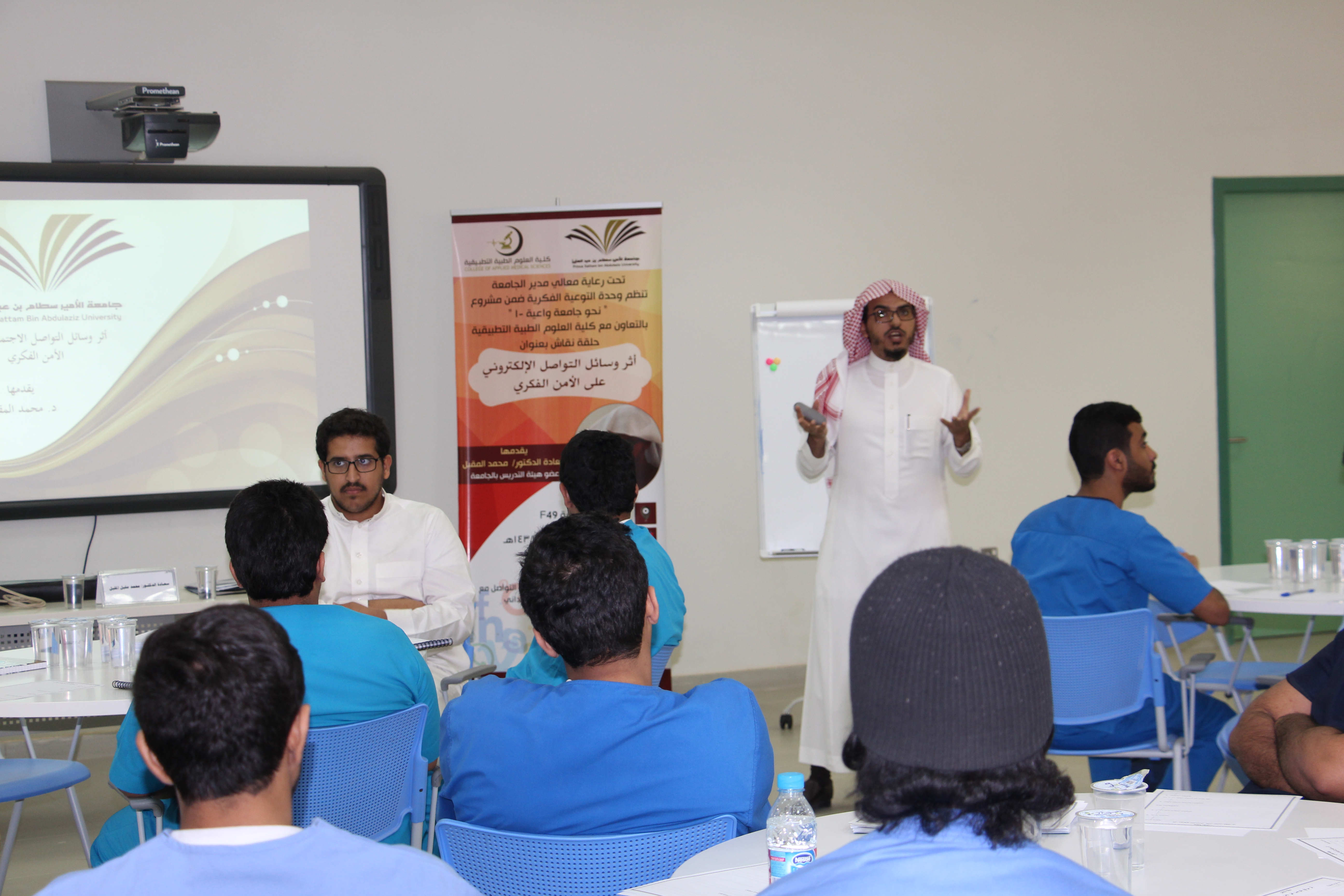 تحت رعاية عميد الكلية الدكتور/ حمدان بن علي الشهري أقامت وحدة التوعية الفكرية ضمن مشروع (نحو جامعة واعية-1) حلقة النقاش الثانية بعنوان "أثر وسائل التواصل الإلكتروني على الأمن الفكري" ألقاها سعادة الدكتور / محمد بن مقبل المقبل عضو هيئة التدريس بالجامعة يوم الاثنين الموافق 7-6-1438ھـ ، بدأ الدكتور حلقة النقاش بتعداد وسائل التواصل الإلكتروني المختلفة وانتشار استخدامها لدى شريحة كبيرة من المجتمع، وغيرها من المحاور المرتبطة بالأمن الفكري.