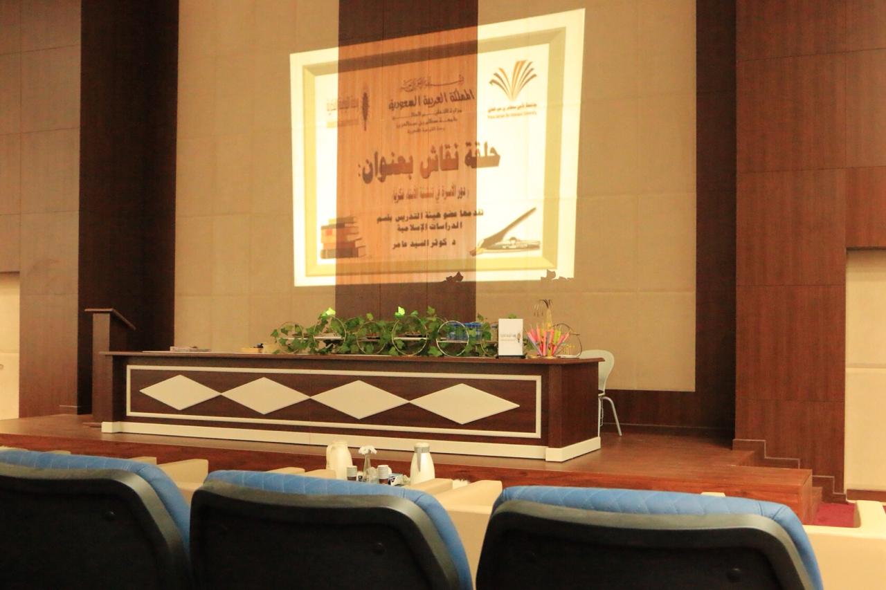 برعاية كريمة من عميد الكلية : د/ سلمان صاهود العتيبي ، وإشراف مباشر من وكيلة الكلية: د/ صفية القحطاني ،وضمن مشروع (جامعة واعية3) ؛ نظمت كلية العلوم والدراسات الإنسانية بالسليل (فرع الطالبات) اليوم الأربعاء الموافق 20/3/1440هـ في الساعة 9:30 صباحاً ،حلقة نقاش بعنوان: (دور الأسرة في تنشئة الأبناء فكرياً) قدمتها عضو هيئة التدريس بقسم الدراسات الإسلامية د. كوثر أحمد السيد عامر ، وبدأت الحلقة بالاستماع إلى آيات من الذكر الحكيم مرتبطة بالموضوع، ثم تطرقت إلى عدد من المفاهيم المتعلقة بالموضوع كالأمن الفكري والغزو الفكري والانحراف الفكري ومفهوم الأسرة ، وبينت أهمية الأمن الفكري وكيفية تحصين الأبناء من أهم المخاطر الفكرية والفكر الضال والمنحرف، وأبرزت أهم الأخطار التي تواجه الأسرة المسلمة في هذا العصر، وختمت الحلقة بمجموعة من التوصيات والتوجيهات التربوية، هذا وقد تخلل الحلقة مجموعة من الأنشطة والمناقشات مع المتدربات اللواتي وصل عددهن إلى 38 متدربة ، وقد تم عرض مجموعة من الفيديوهات التوعوية المناسبة .
