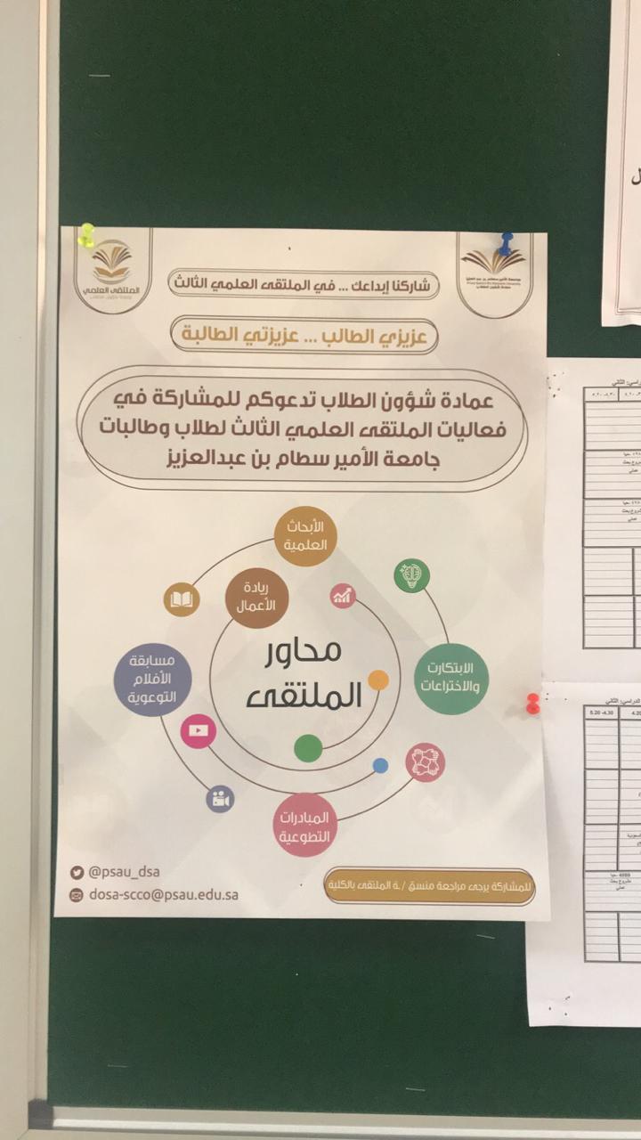 أطلق مكتب العمل الطلابي بإشراف منسقة الملتقى العلمي الثالث الأستاذة سحر العسرج في كلية العلوم والدراسات الإنسانية بالخرج (طالبات) يوم الأحد الموافق 2/4/1440هـ حملة إعلانية للمشاركة في الملتقى العلمي الثالث لجميع طالبات الكلية، حيث كان الهدف من هذه الحملة هو التعريف بالملتقى عن طريق نشر الإعلانات باللوحات الإعلانية والبنرات وشاشات العرض.