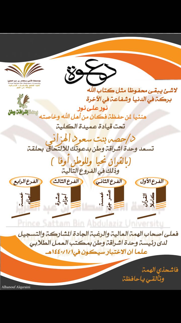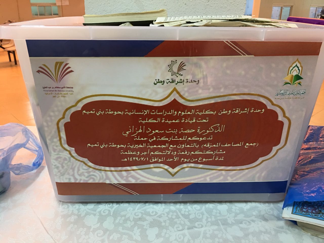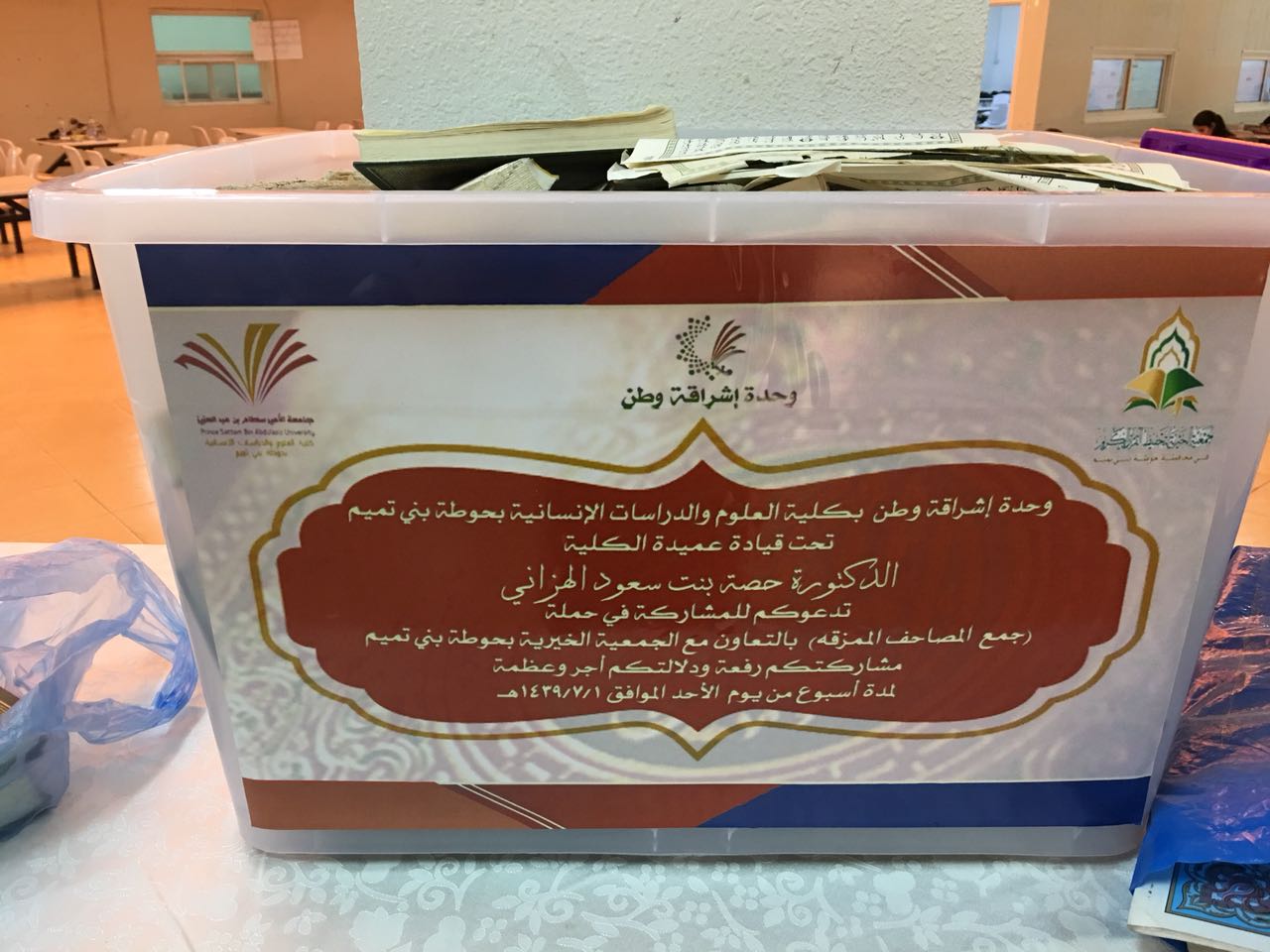 في يوم الأحد الموافق 1/ 7 / 1439 هـ وبتمام الساعة التاسعة والنصف وتحت قيادة عميدة الكلية الدكتورة حصة بنت سعود الهزاني، انطلقت وحدة إشراقة وطن بالتعاون مع الجمعية الخيرية بحوطة بني تميم بحملة (بالقرآن نحيا) والتي تهدف إلى جمع المصاحف الممزقة حفاظاً على كتاب الله الذي به حياة الفرد والوطن. وقد انطلقت الحملة بتفاعل الطالبات والمنسوبات والبحث في مرافق الكلية عن المصاحف الممزقة وجمعها معلنين للجميع أن الحملة ممتدة لمدة أسبوع بإذن الله.