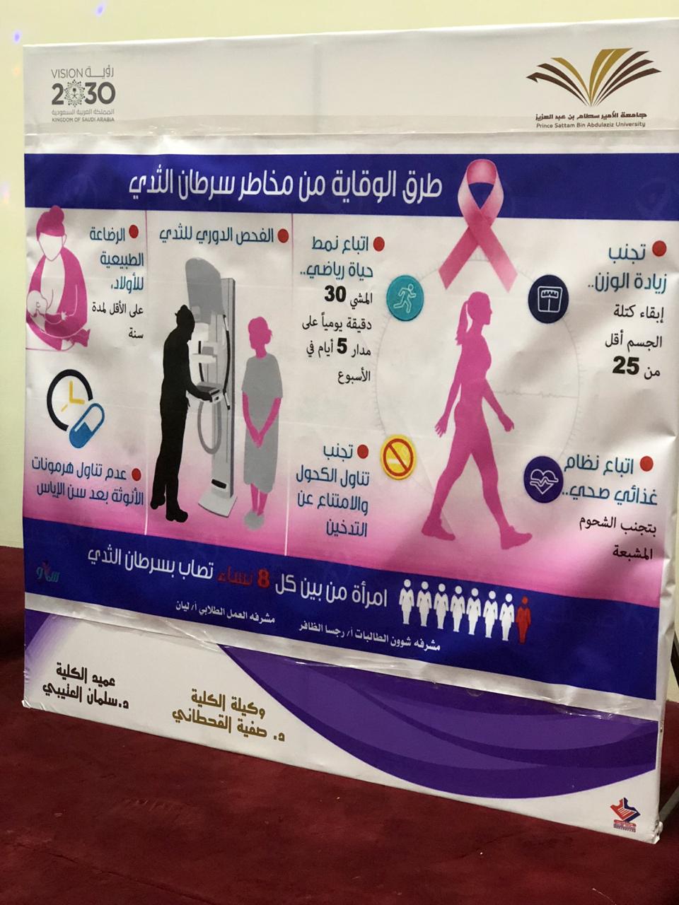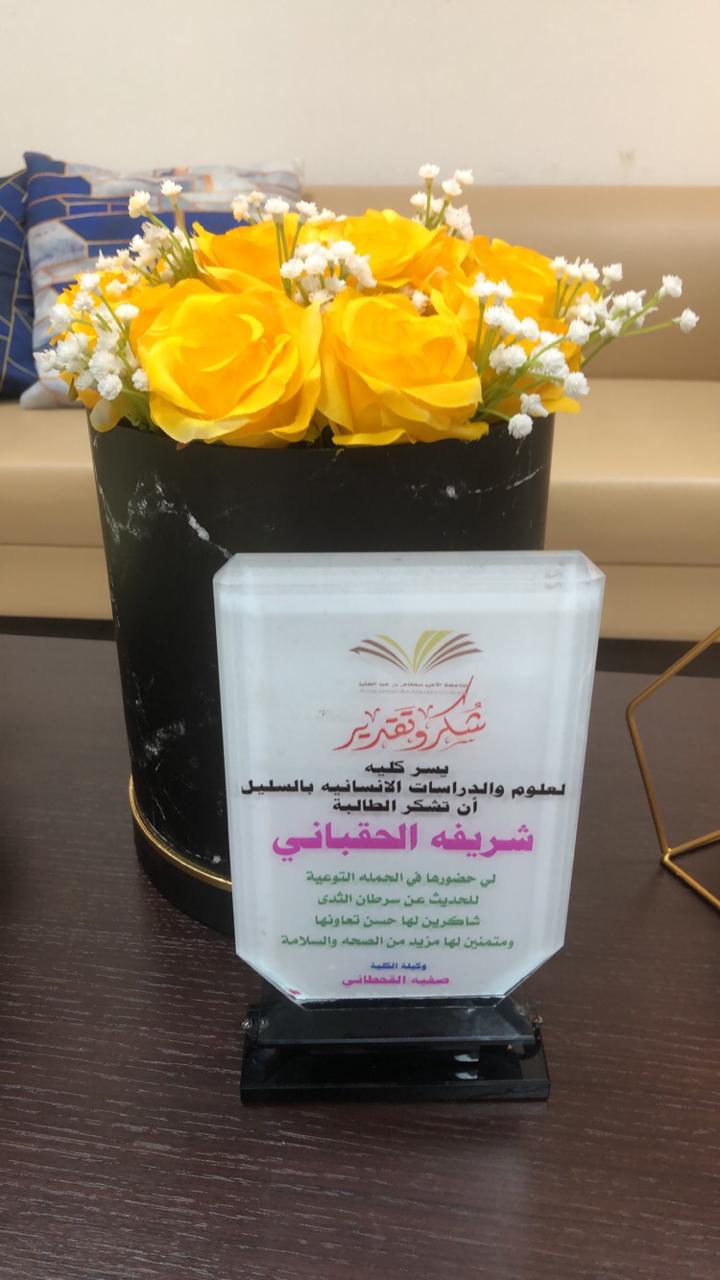 برعاية كريمة من عميد كلية العلوم والدراسات الإنسانية بالسليل د.سلمان العتيبى و وكيلة الكلية د.صفية القحطاني بالتعاون مع إدارة مستشفى السليل العام د. سعد ال وديان شاركت طالبات قسم اللغة العربية وآدابها فى حملة توعوية بعنوان كونى بخير (معاً ضد السرطان) وقد أُستضيفت شريفة الحقباني إحدى الحالات المتعافية من السرطان و تحدثت عن حالتها وكيفية صمودها أمام المرض بإيمانها بالله عز وجل وأملها فى الحياة وكان شعارها (الحياة أحلى بشوية أمل).