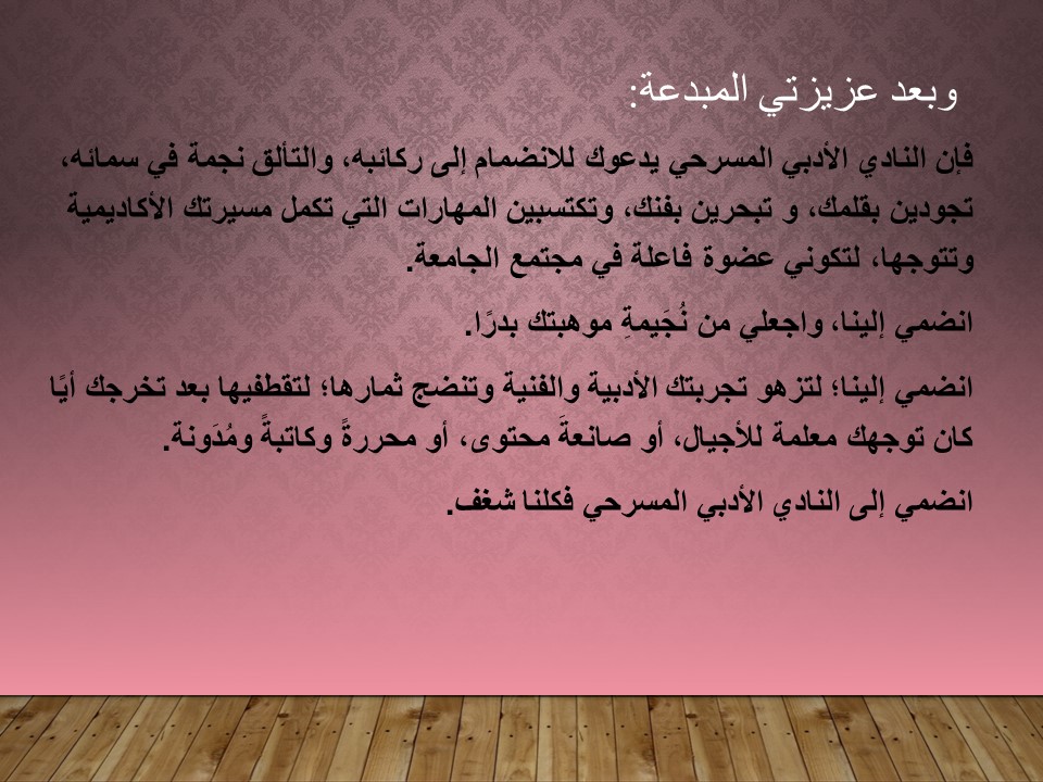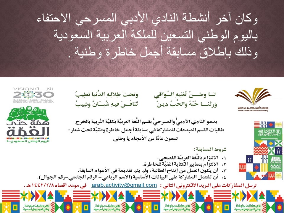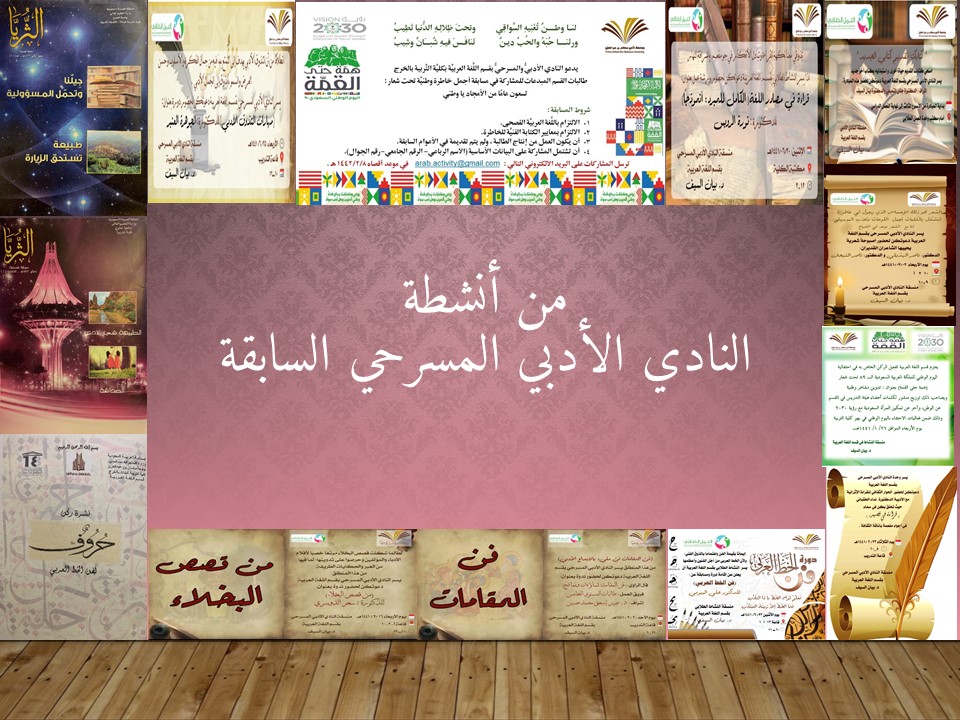 أقام قسم اللغة العربية ممثلاً بمنسقة النادي الأدبي المسرحي الأستاذة مارية القرعاوي ،في يوم الثلاثاء الموافق 19/2/1442هـ، بحضور مجموعة من طالبات الكلية حملة تعريفية بالنادي الأدبي المسرحي ورؤيته ورسالته وأهدافه وأنشطته السابقة على منصة زووم وقد قدمت العرض التعريفي بهذه الحملة الطالبتان المشاركتان في عضوية النادي الأدبي المسرحي : رهف الخليوي وطيف العنزي وقد أُعلِن عن إقامة هذه الحملة عبر حساب وحدة العمل الطلابي على تويتر . وتهدف الحملة للتعريف بالنادي الأدبي المسرحي لطالبات الكلية ودعوتهن للانضمام إليه.