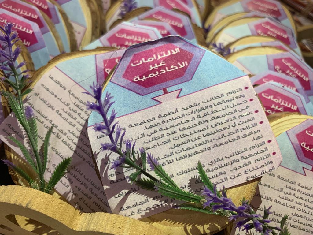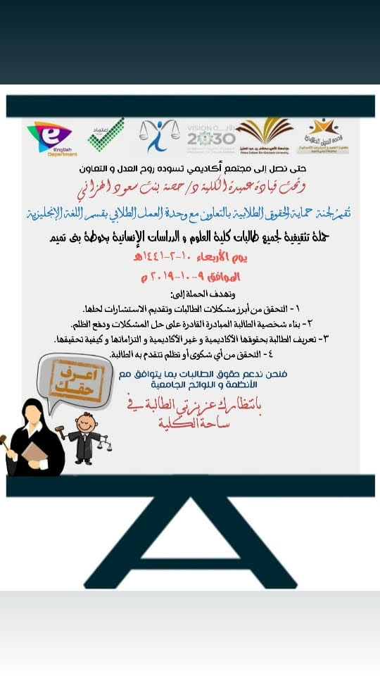 حتى نصل إلى مجتمع أكاديمي تسوده روح العدل و التعاون، و تحت قيادة سعادة عميدة الكلية د. حصة بنت سعود الهزاني، أقامت لجنة حماية الحقوق الطلابية بالتعاون مع وحدة العمل الطلابي حملة تثقيفية لجميع طالبات كلية العلوم والدراسات الإنسانية بحوطة بني تميم بقسم اللغة الإنجليزية، يوم الأربعاء الموافق ١٤٤١/٢/١٠هـ في بهو الكلية. بُدئت الحملة بنقاش أ. شروق الحميضي مع الطالبات لبعض من حقوقهن و التزاماتهن الأكاديمية وغير الأكاديمية، و قد سعت الحملة إلى تحقيق الجوانب التالية: التعرف على أبرز مشكلات الطالبات و السعي لحلها- تثقيف الطالبات بواجباتهن وحقوقهن - تعريف الطالبات بلجنة الحقوق الطلابية و كيفية التواصل مع أعضائها. كما تم توزيع منشورات توضح للطالبات أبرز مهامهن و التزاماتهن، إضافة إلى منشورات بسيطة تم توزيعها في مكاتب الأعضاء لتذكيرهن بأبرز الحقوق الطلابية. واختتمت الحملة التوعوية بتسجيل أسماء جميع الطالبات المستفيدات منها، وشكرهن على الحضور.