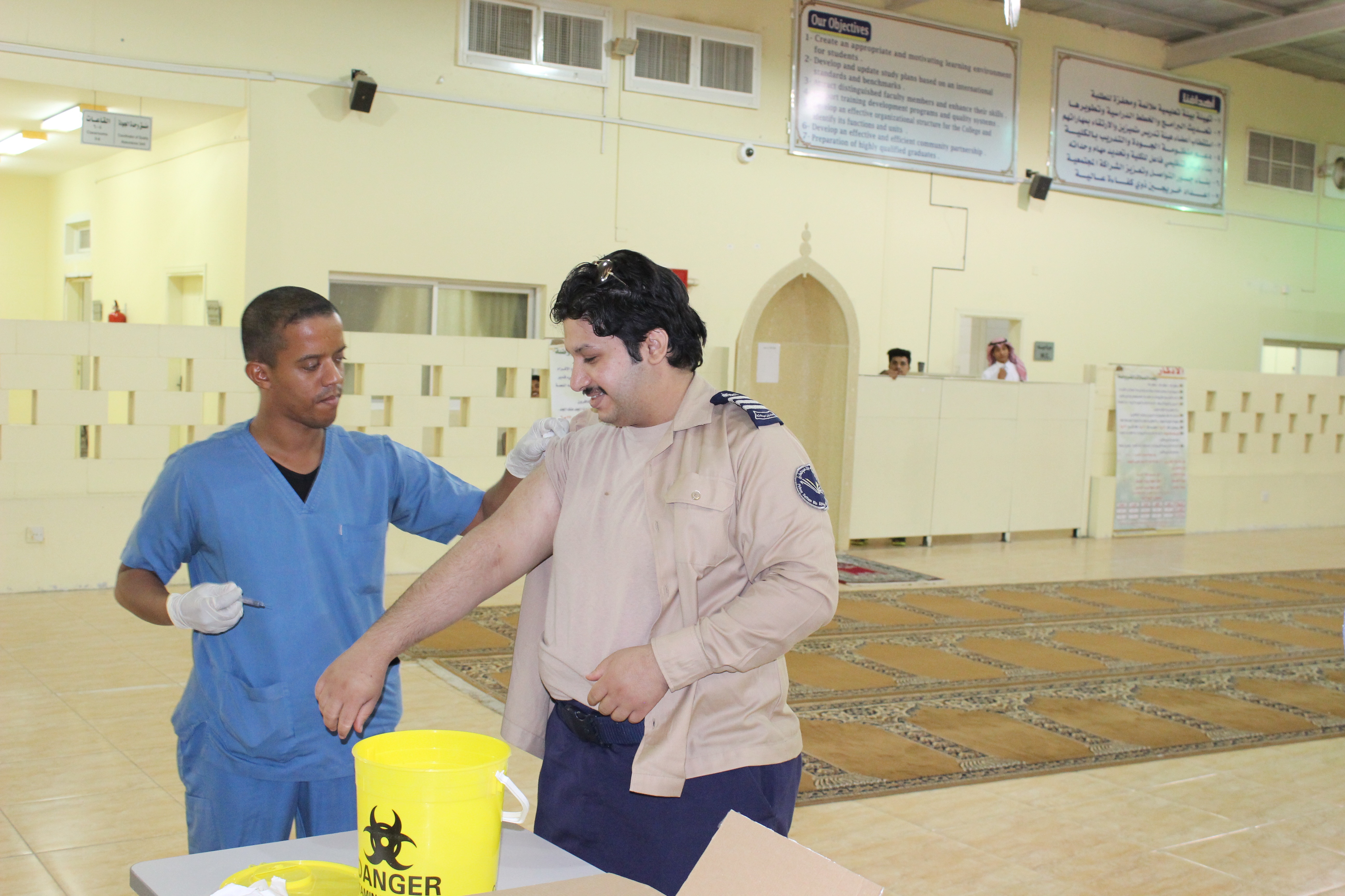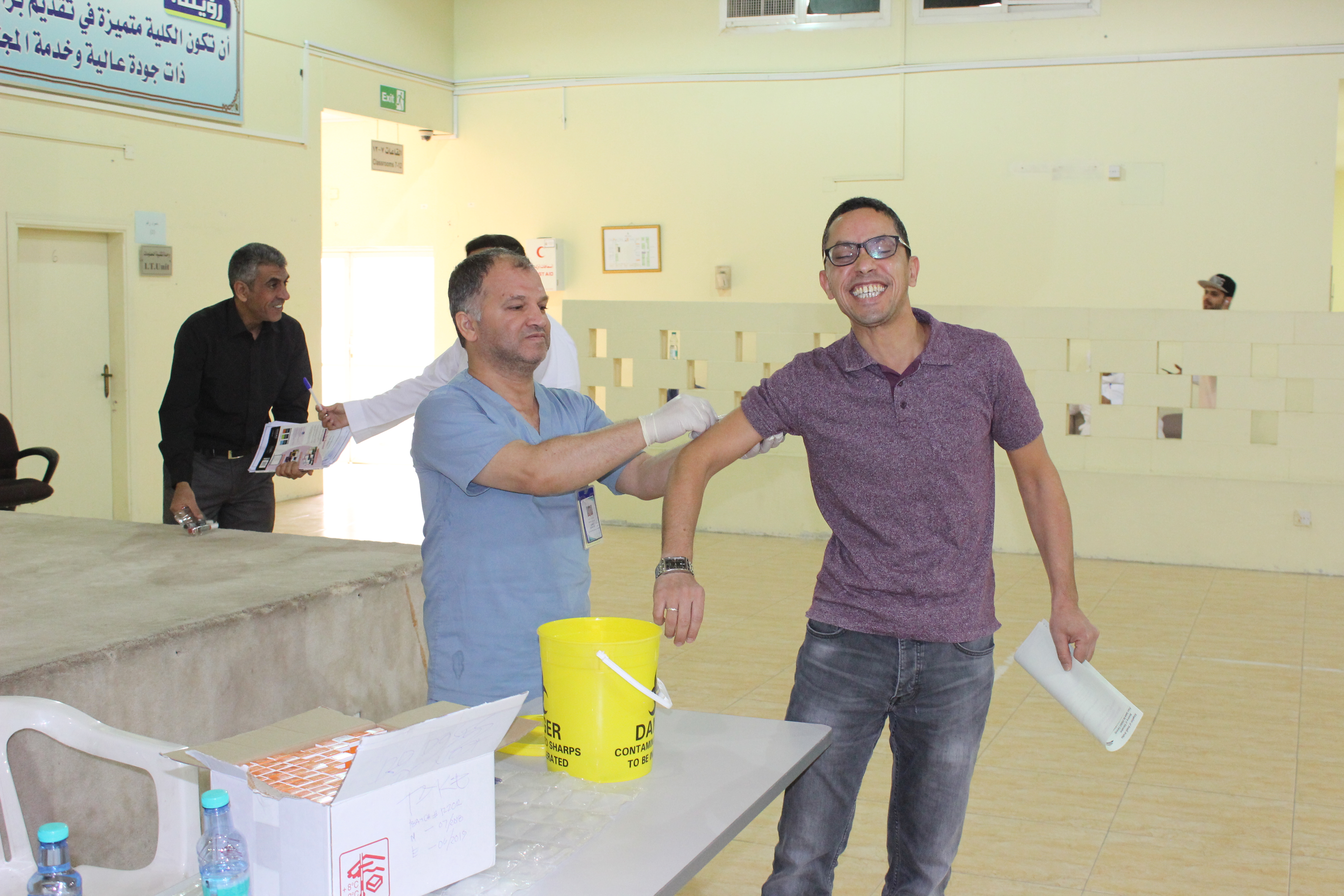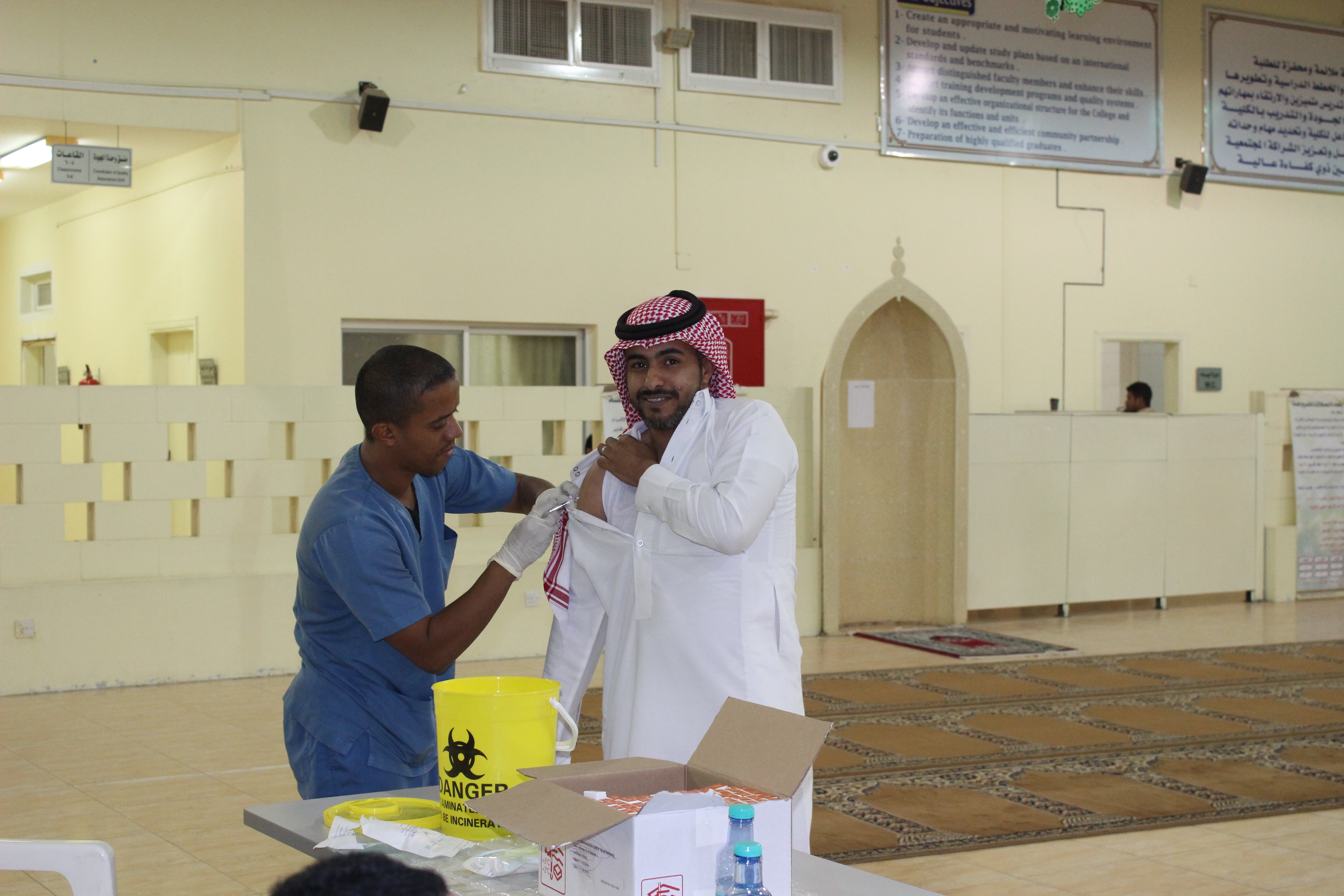 نظمت وحدة العلاقات العامة والاعلام بكلية المجتمع بالخرج حملة للتطعيم ضد الأنفلونزا الموسمية بالتعاون مع مستوصف صحي السيح بالخرج وذلك يوم الاربعاء الموافق 15/2/1440هـ وقد تم تطعيم أكثر من (100) طالب في المستويات المختلفة بالكلية، وكذلك تطعيم منسوبي الكلية من أعضاء هيئة التدريس والموظفين ورجال الامن ، وقد أشاد سعادة الأستاذ الدكتور/ سعيد بن نزال العنزي عميد الكلية بجهود مستوصف صحي السيح بالخرج في نشر الوعي الصحى بين طوائف المجتمع المختلفة وأكد سعادته على أهمية التعاون مع المستوصف في تنظيم حملات توعوية مختلفة مثل مكافحة التدخين، والمخدرات وغيرها من القضايا التى تهدد حياة الطلاب