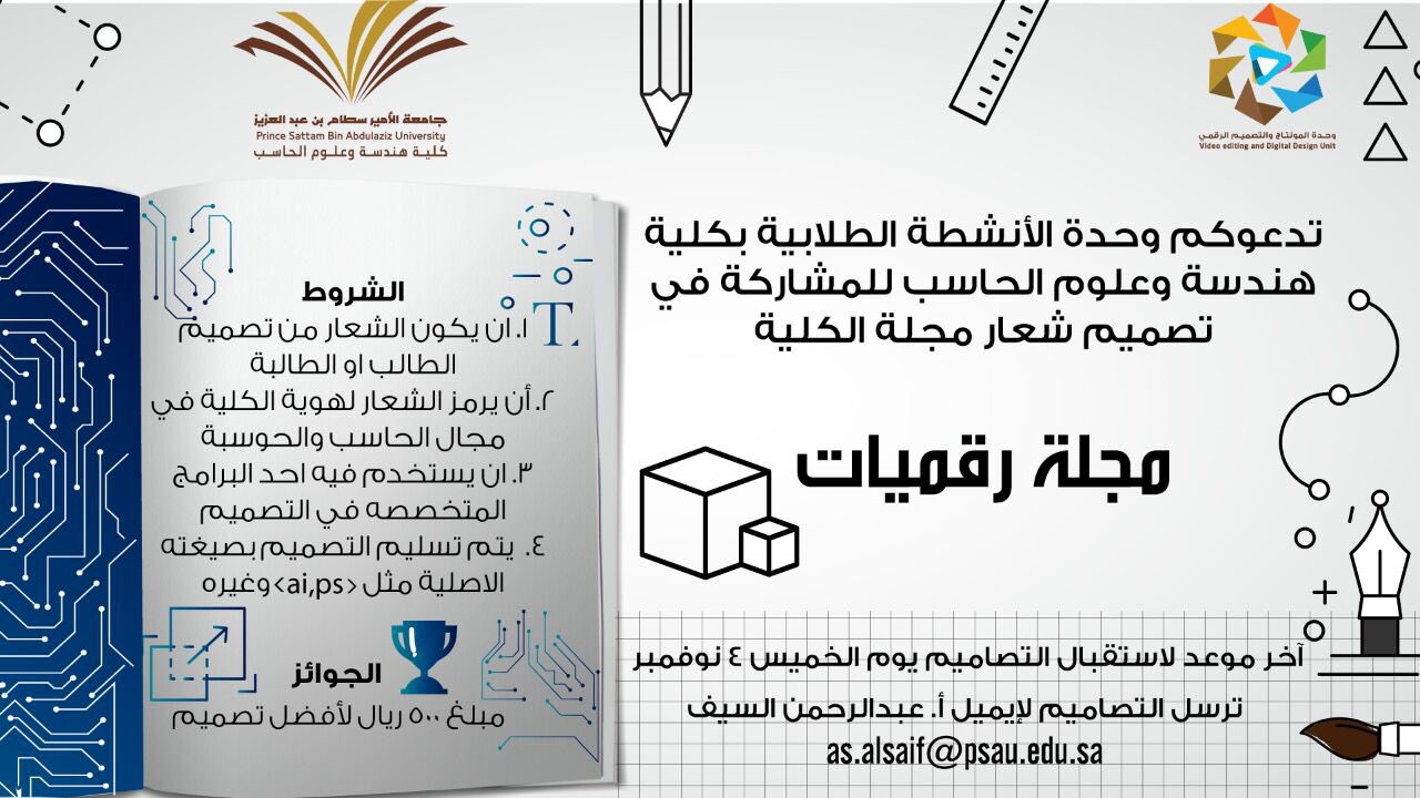 تدعو وحدة الأنشطة الطلابية بكلية هندسة وعلوم الحاسب بالتعاون مع نادي الحاسب طلاب وطالبات جامعة الأمير سطام بن عبد العزيز للمشاركة في تصميم شعار "مجلة رقميات".