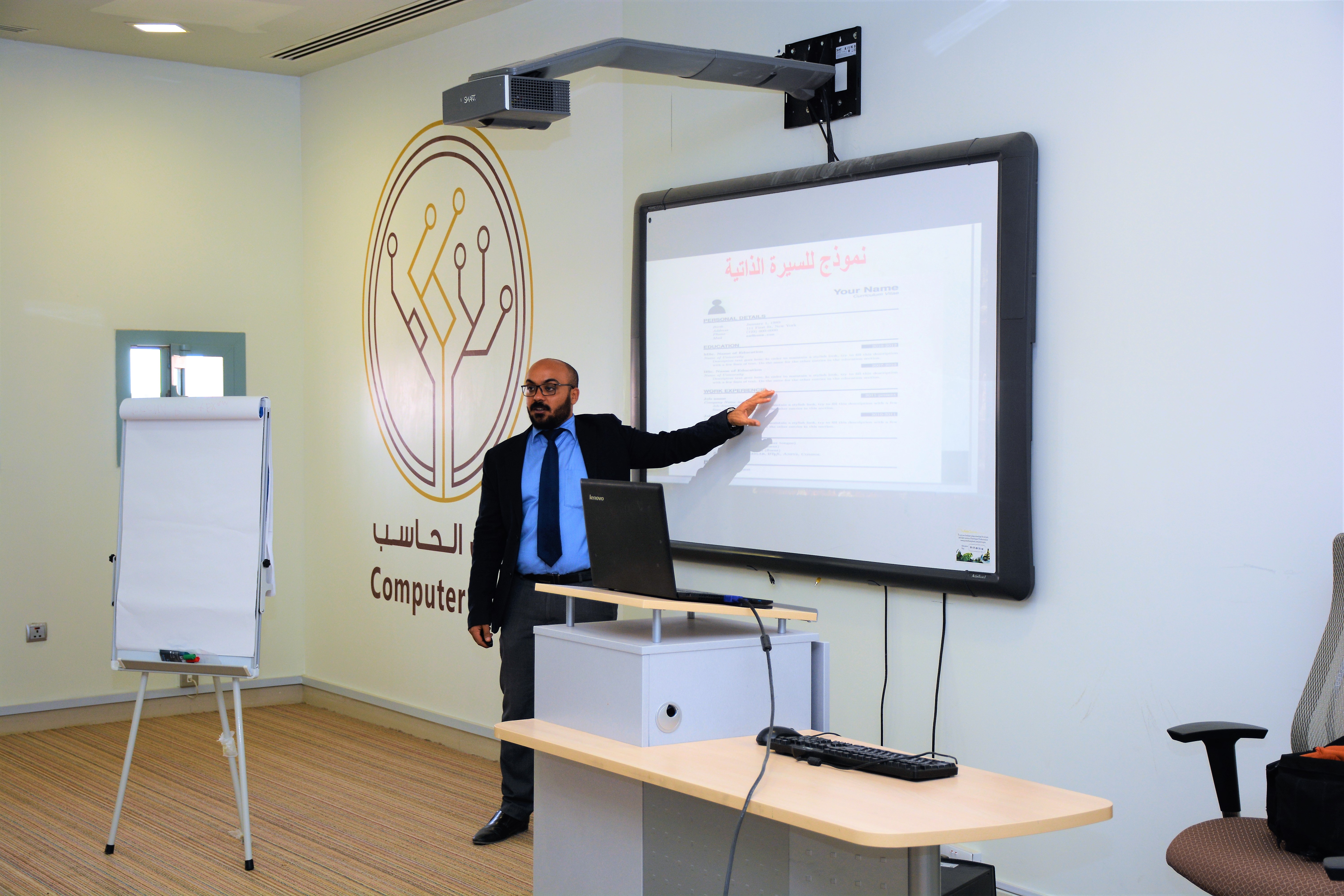 ثم تحدث الأستاذ محمد عن تعريف السيرة الذاتية واهميتها ومن ثم الدخول الى الجانب الشكلي ومضمون السيرة الذاتية وشارك الطلاب في كتابة نموذج للسيرة الذاتية اثناء الورشة وانتقل بعد ذلك الى المحور الاخر من الورشة وهو المقابلة الشخصية حيث تم تعريفها والتنويه عن الأنواع المختلفة للمقابلات الشخصية وكيفية التعامل مع كل نوع، ثم الحديث عن المراحل المختلفة للمقابلة الشخصية كالاستعداد لما قبل المقابلة، وما بعدها.