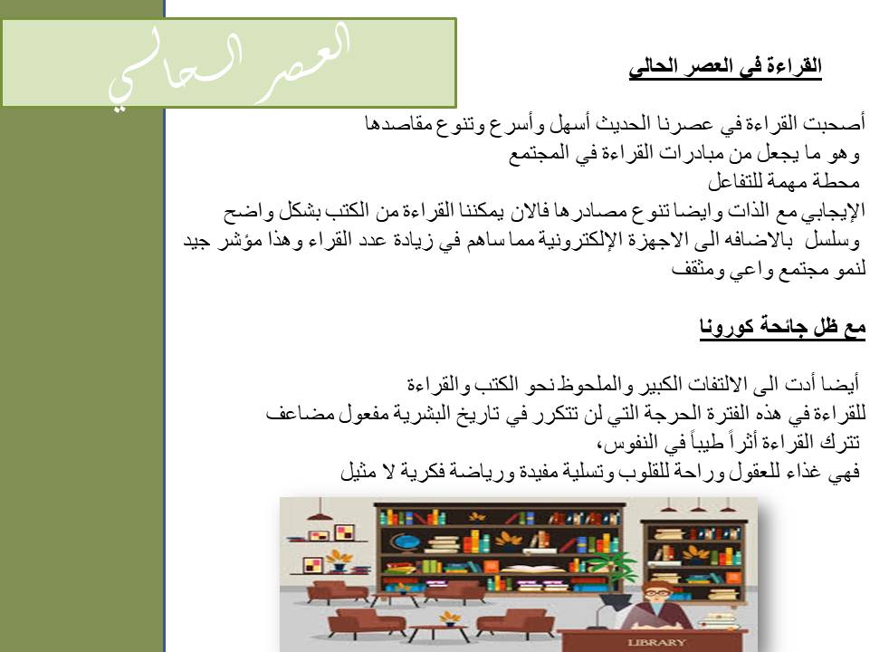 أقام نادي القراءة في عمادة السنة التحضيرية- قسم الطالبات ندوة بعنوان "حقبة القراءة" عبر منصة البلاك بورد، وذلك يوم الاربعاء الموافق 20-2-1442هـ. ركزت الندوة والتي كانت منوعة في تقديمها على أن القراءة مرت بحقبات تغيير عبر تاريخ شبه الجزيرة العربية، وبدأت بالقراءة الصامتة ثم الجهرية في فجر التاريخ، واستعرضت الندوة بداية القراءة على صفحات أوراق البردى في المخطوطات وتطورت للكتابة على الحجر وعلى القماش، كما تعد القراءة أول ما نزل من وحي في ديننا الحنيف. وتطرقت الندوة إلى أنواع القراءة أهمها الاستكشافية والسريعة والتحليلية، والمراحل التي مرت بها القراءة عبر العصور، مروراً بعصر الطباعة باستخدام آلات الطباعة، وانتهاء بالعصر الحديث الذي تميز بالقراءة الإلكترونية وفي نهاية الندوة ألقت طالبات النادي الضوء على أهمية القراءة في ظل جائحة كورونا وما تبعه من تغير ملحوظ واهتمام بالكتب والقراءة.