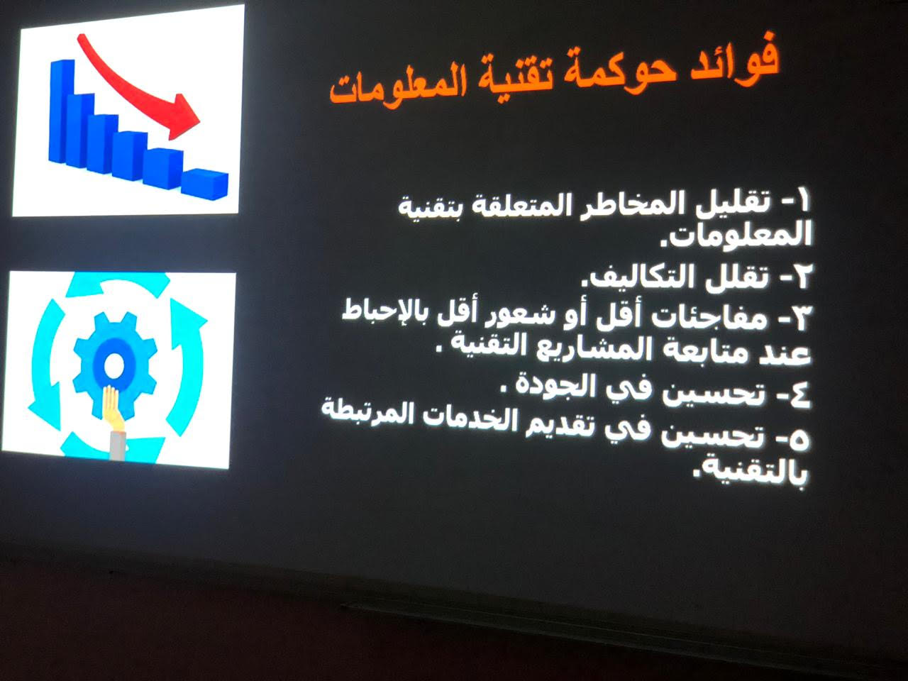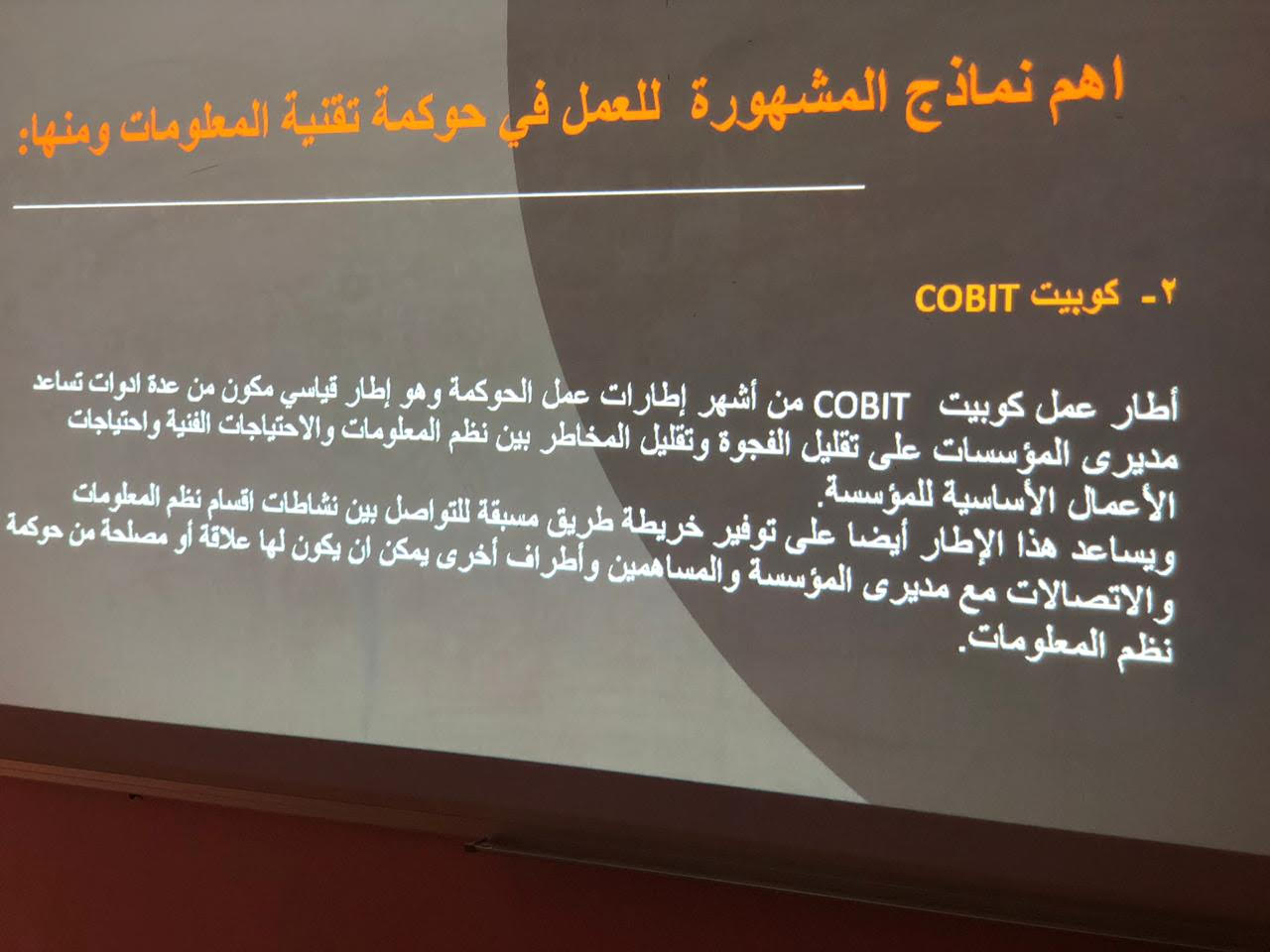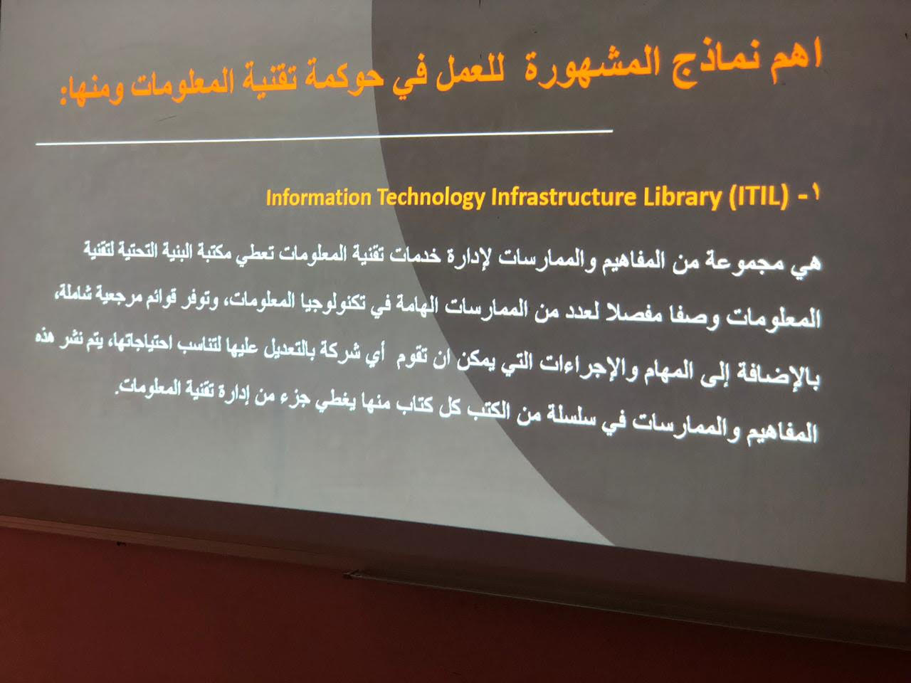 استكمالاً للدورات التدريبية وورش العمل والمحاضرات التثقيفية للملتقى التقني الأول الذي تقيمه كلية المجتمع بالخرج عقدت يوم الأحد الموافق 19/6/1440هـ محاضرة تحت عنوان " حوكمة تقنية المعلومات " من تقديم الأستاذة/ ساره القحطاني، حيث اشتملت المحاضرة على عدد من المحاور كان من أهمها: