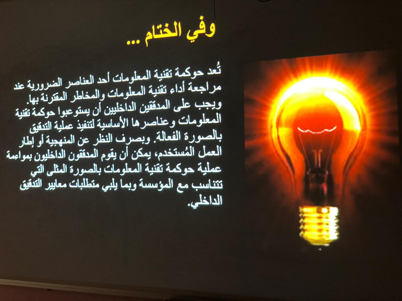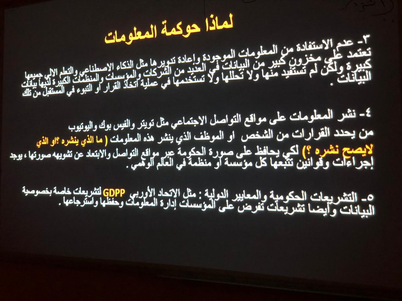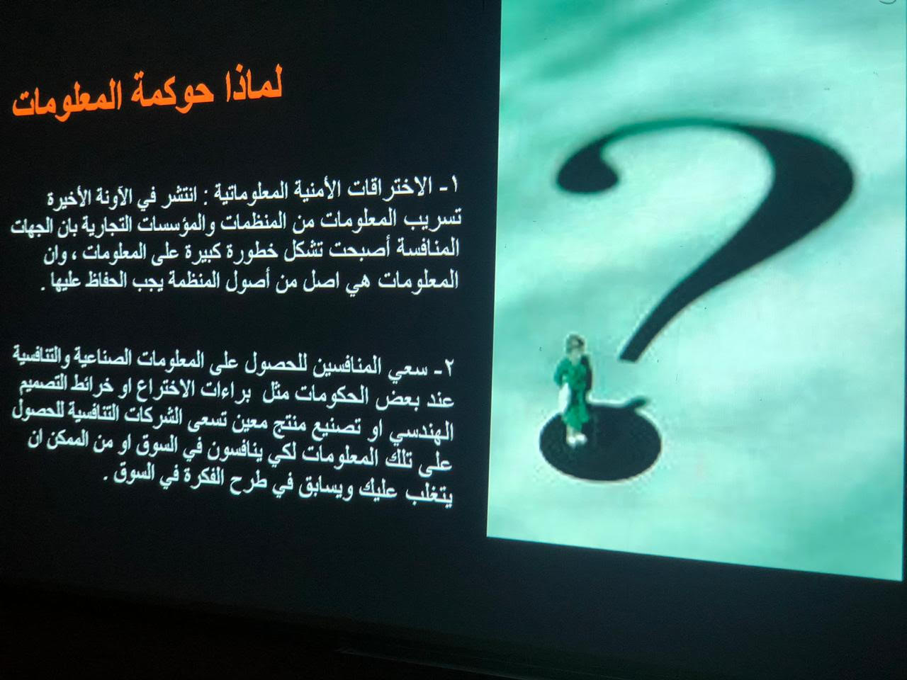 استكمالاً للدورات التدريبية وورش العمل والمحاضرات التثقيفية للملتقى التقني الأول الذي تقيمه كلية المجتمع بالخرج عقدت يوم الأحد الموافق 19/6/1440هـ محاضرة تحت عنوان " حوكمة تقنية المعلومات " من تقديم الأستاذة/ ساره القحطاني، حيث اشتملت المحاضرة على عدد من المحاور كان من أهمها: