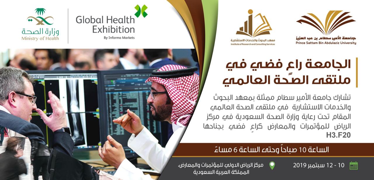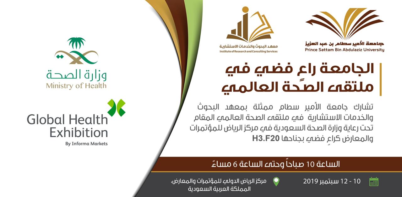 تشارك جامعة الأمير سطام بن عبد العزيز – ممثلة في معهد البحوث والخدمات الاستشارية – في ملتقى الصحة العالمي، كراعٍ فضيّ، والمقام في مركز الرياض للمؤتمرات والمعارض برعاية وزارة الصحة في الفترة من 10-12 سبتمبر 2019م بجناح رقم H3.f20 .
