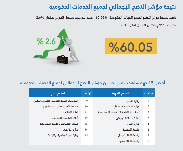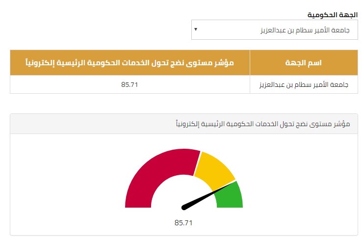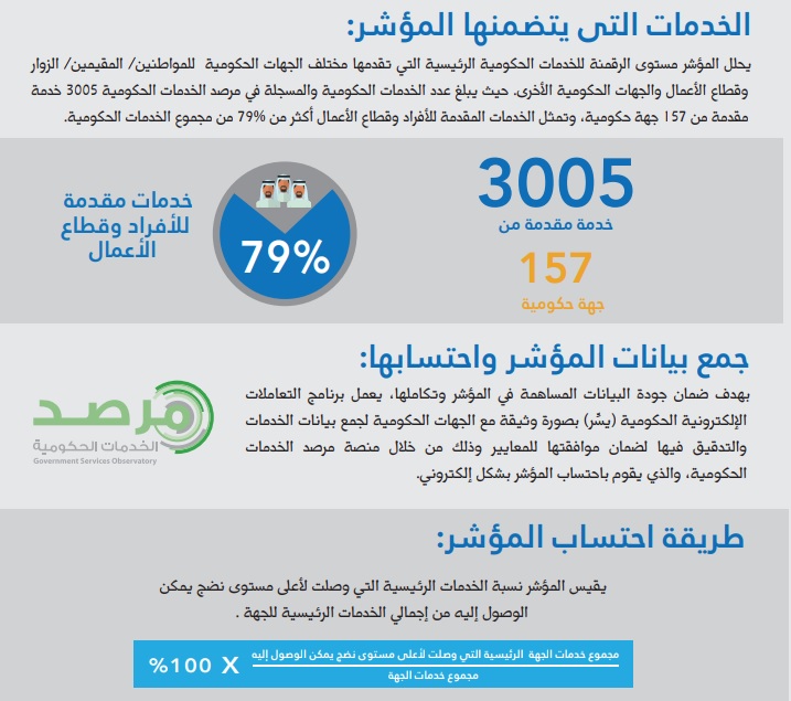 هذا المؤشر يعتبر أحد مؤشرات الأداء الرئيسية في خطة التحول الوطني 2020 حيث أن المستهدف هو الوصول إلى نسبة 85% كنسبة إجمالية لجميع الجهات الحكومية .