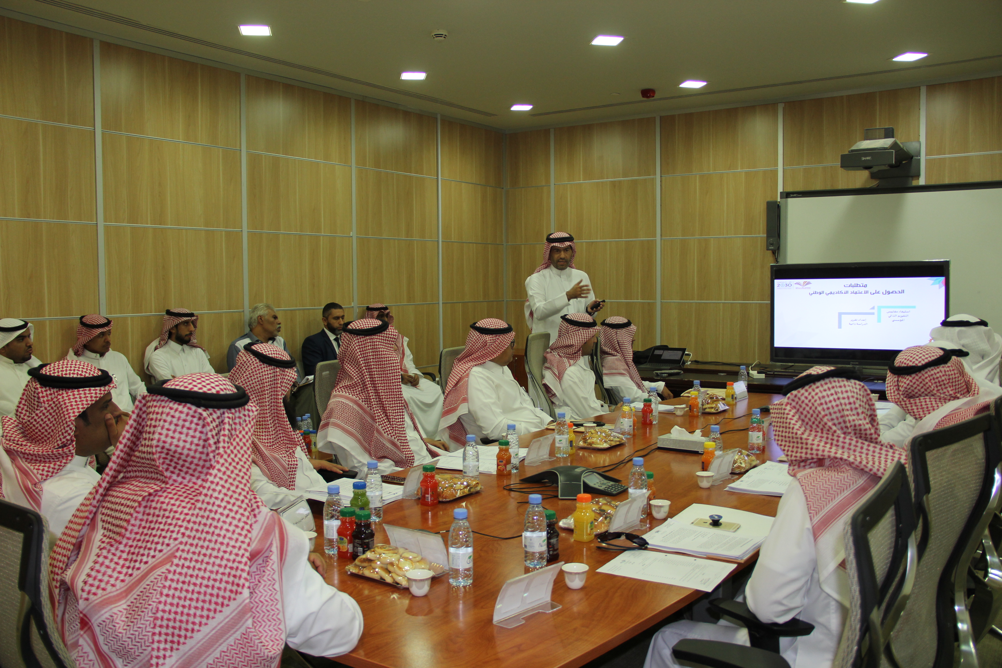 بعد ذلك استعرض السهلي المرحلة الحالية وهي مرحلة الاعتماد الأكاديمي الوطني، والتي تتطلب استيفاء متطلبات ومعايير المركز الوطني للتقويم والاعتماد الأكاديمي وذلك طبقا للخطة الزمنية التي وضعت من قبل عمادة التطوير والجودة بدءًا بتشكيل اللجان وفرق العمل وصولاً لتحديد دور ومهام كل لجنة وفريق في استيفاء الدراسة التقويمية للجامعة، وكذلك التنسيق مع المركز الوطني من أجل زيارة فريق خبراء الاعتماد.