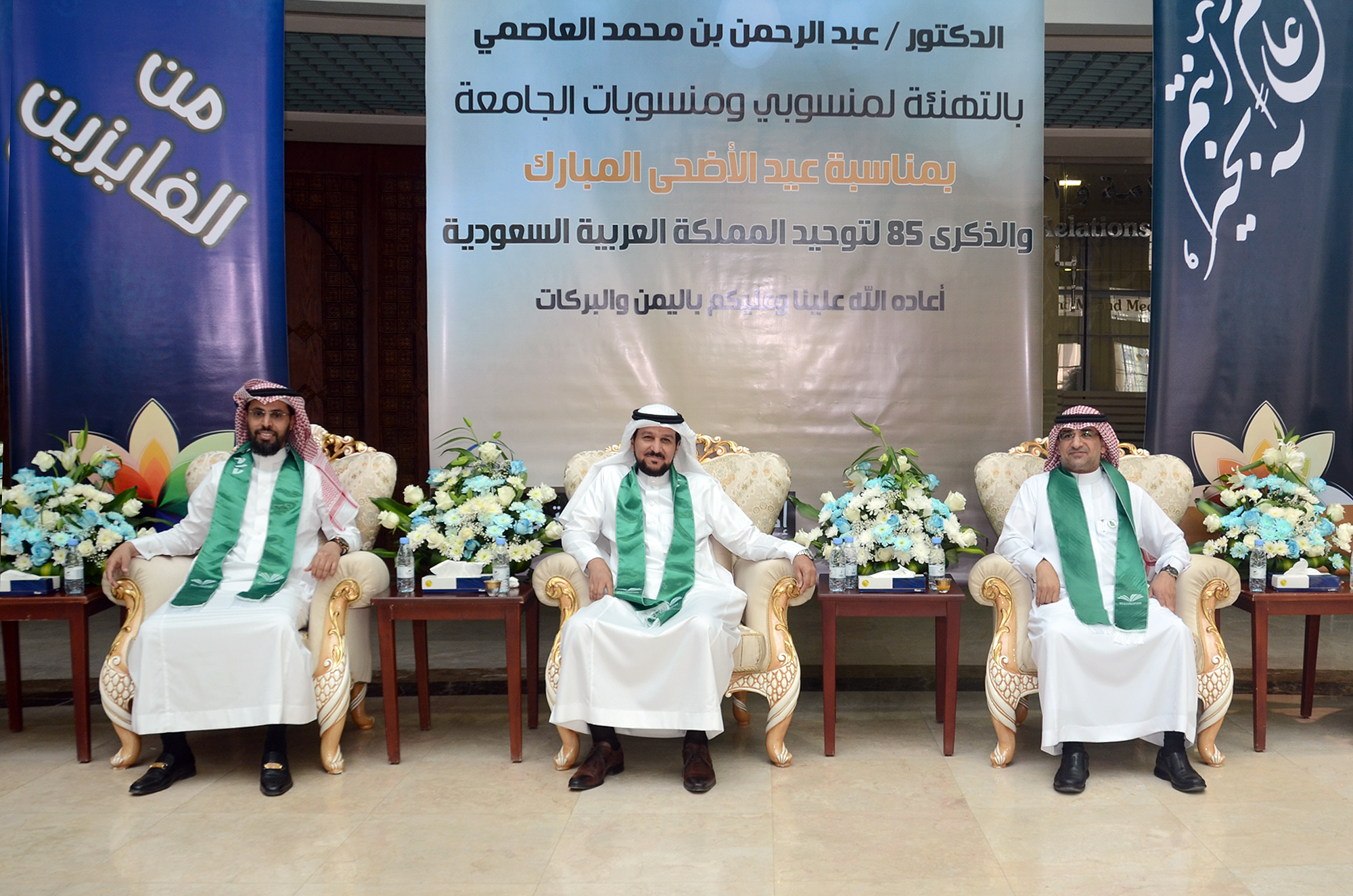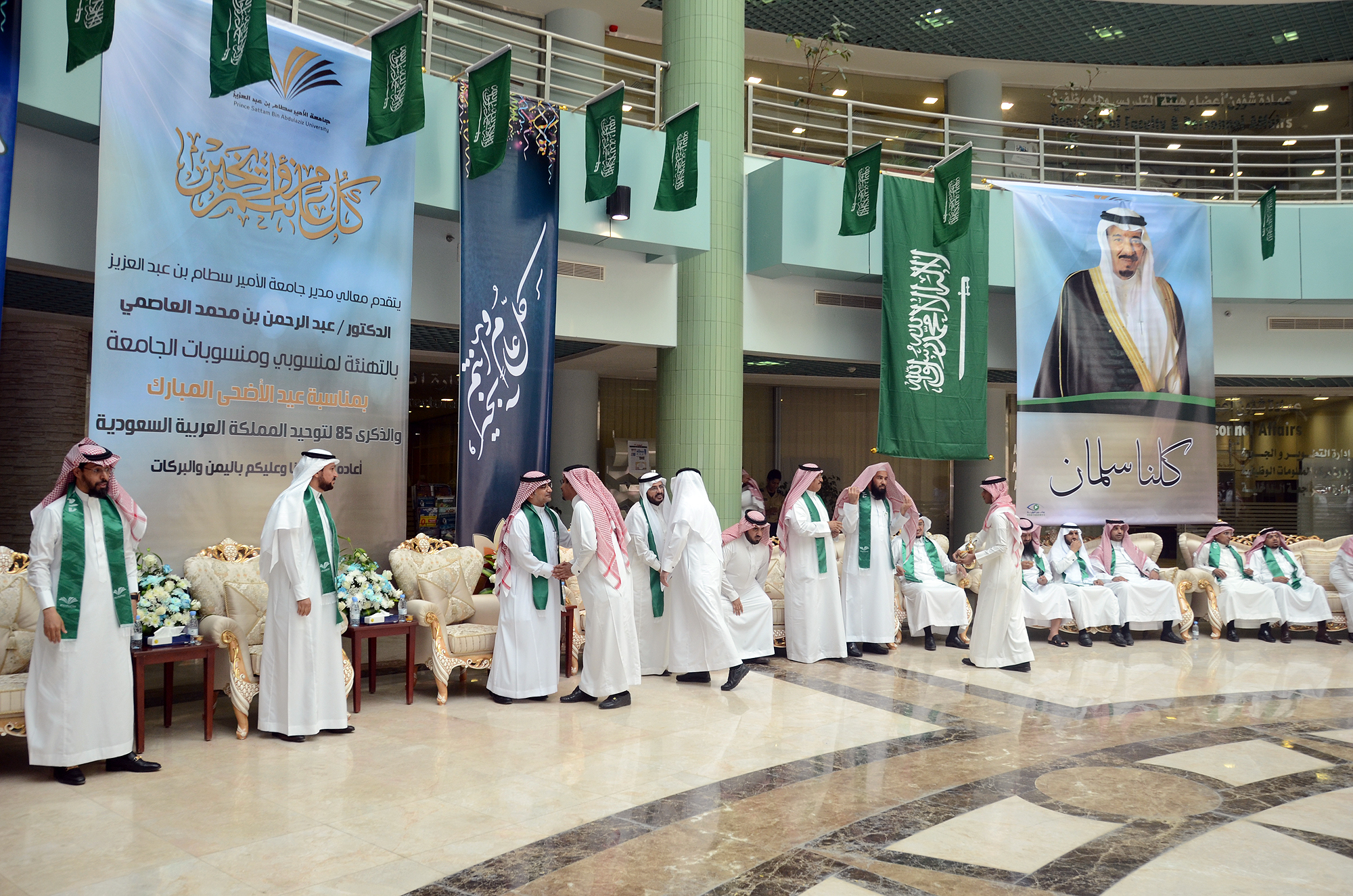 نظمت إدارة العلاقات العامة والإعلام بجامعة الأمير سطّام بن عبد العزيز حفل معايدة وتهنئة لمنسوبي الجامعة بمناسبة اليوم الوطني للمملكة العربية السعودية وعيد الأضحى المبارك ، وذلك يوم الأحد الموافق 21/12/1436 بالبهو الرئيسي للجامعة بالمدينة الجامعيّة بالسيح.