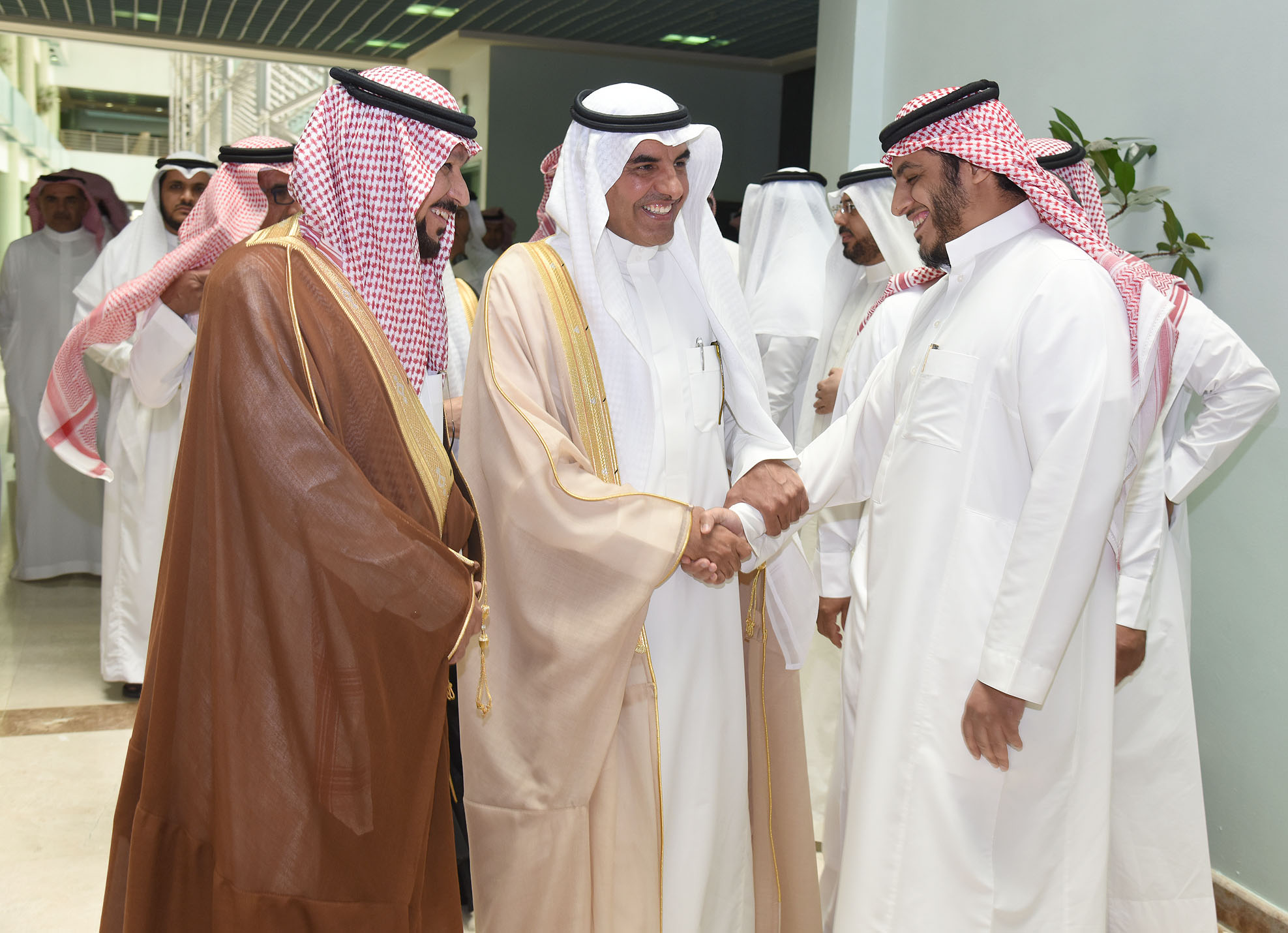 بدأ الحفل بكلمة لمدير الجامعة المكلف الأستاذ الدكتور عبد العزيز بن عبد الله الحامد تقدم فيها بالشكر للحضور على مشاركتهم منسوبي الجامعة هذه المناسبة العزيزة التي تقيمها الجامعة احتفاء بالثقة الملكية الكريمة بتعيين أحد أبناء هذه الجامعة البررة، مديرها السابق معالي الدكتور عبد الرحمن بن محمد العاصمي نائبًا لوزير التعليم، حيث عدد الحامد الأيادي البيضاء التي كانت لمعالي الدكتور العاصمي على الجامعة منذ توليه قيادتها وحتى مساء السبت الذي استمع فيه الجميع إلى الأمر الملكي بتعيين معاليه نائبًا لوزير التعليم ، فامتزجت المشاعر بين حزن على فراق شخص كانت له بصماته الواضحة وإخلاصه للوطن، وبين فرح بهذه الثقة الملكية الغالية.