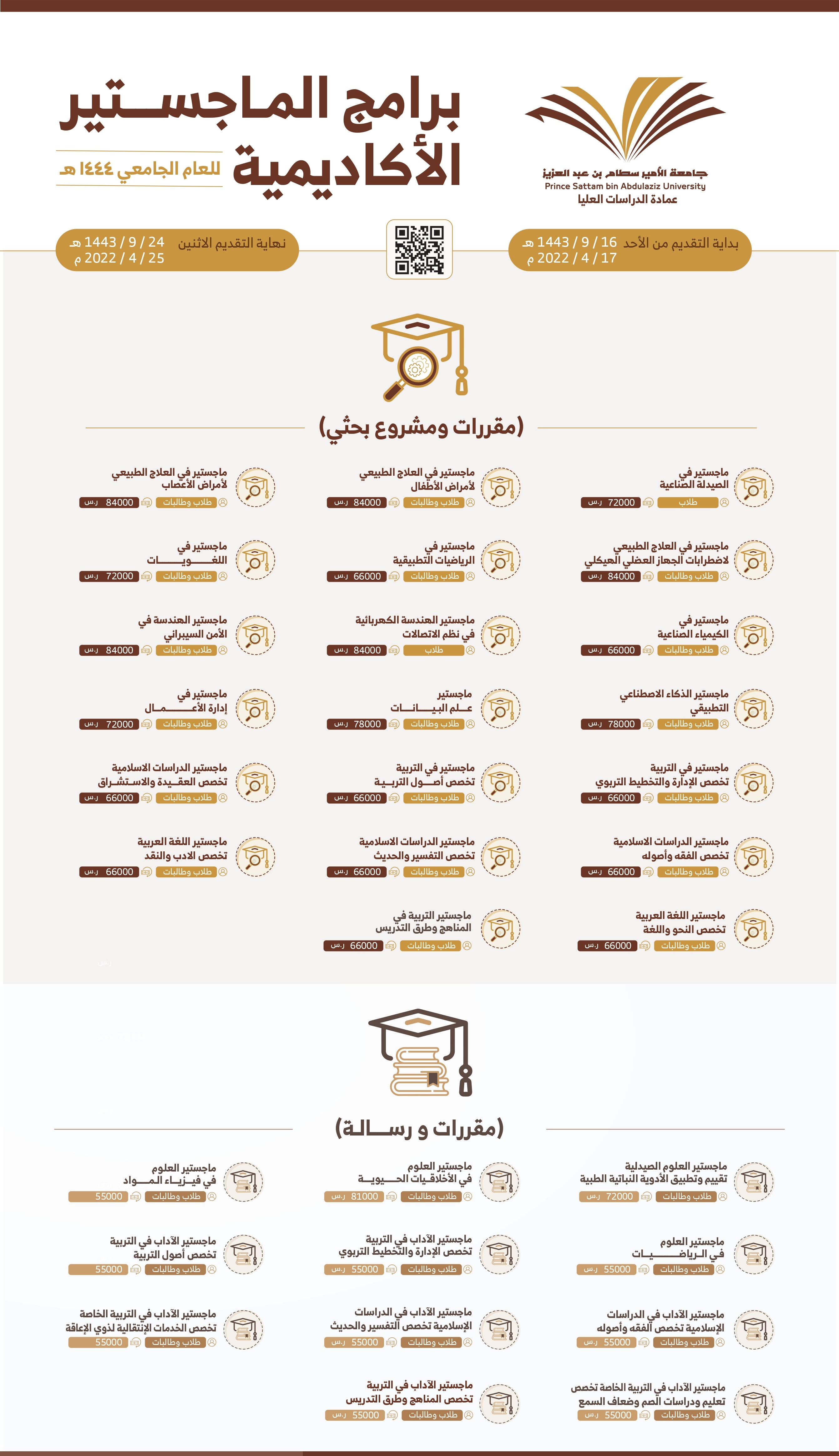 تعلن عمادة الدراسات العليا بجامعة الأمير سطام بن عبدالعزيز عن فتح باب القبول في 31 برنامجاً للدراسات العليا لمرحلة الماجستير