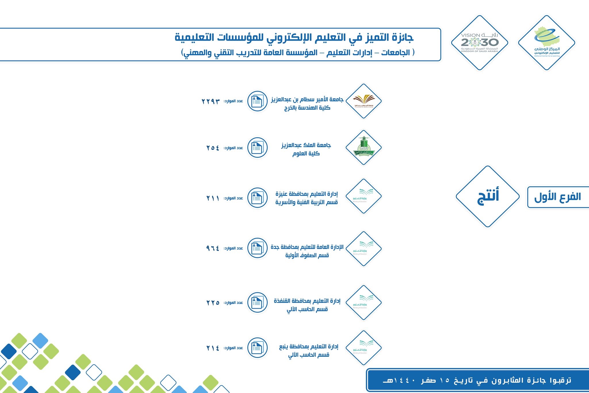 وتهدف الجائزة التي ينظمها المركز الوطني للتعليم الالكتروني إلى النهوض بمستوى التعلم في المملكة ليواكب الحراك العالمي في مجال التعلم الإلكتروني ويكون رافداً أساسياً للتعليم والتعلم مدى الحياة.
