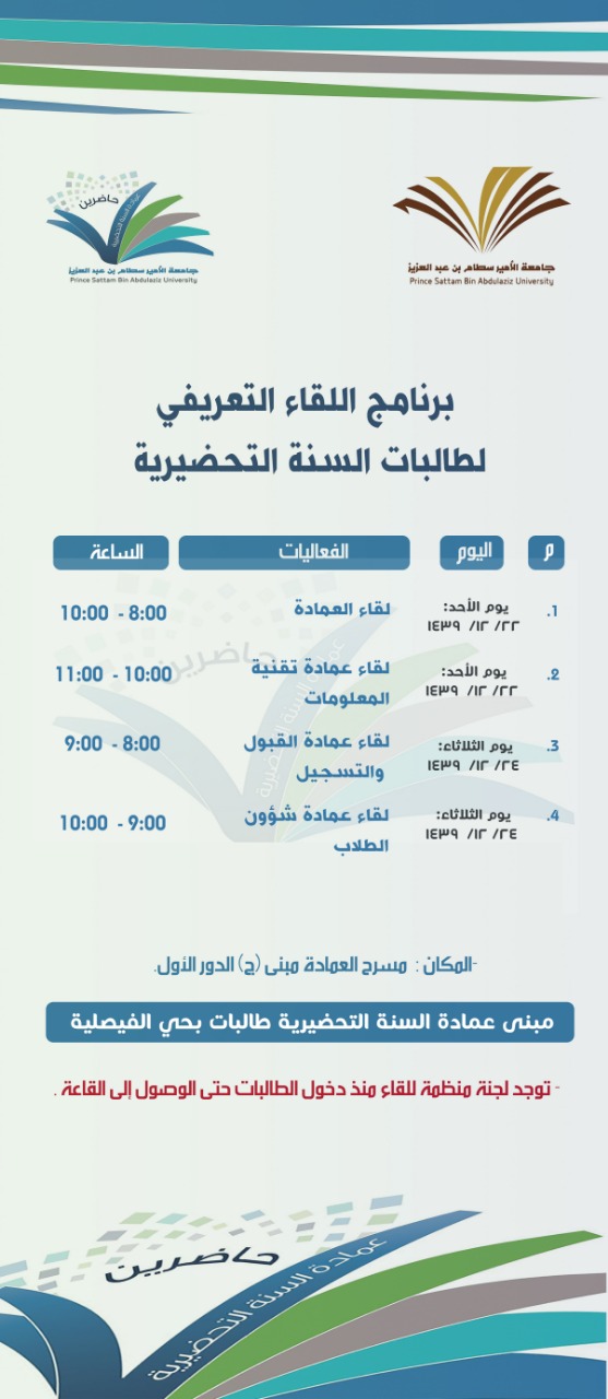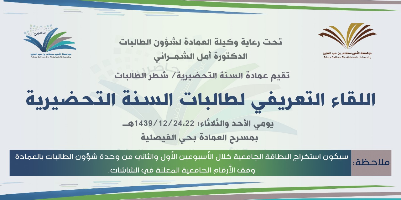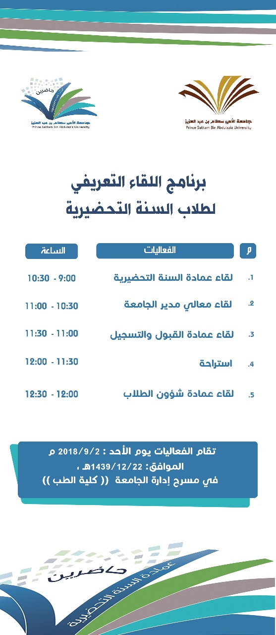 برعاية معالي مدير جامعة الأمير سطام بن عبدالعزيز الدكتور عبدالعزيز بن عبدالله الحامد تنظم عمادة السنة التحضيرية الأحد المقبل ٢٢ / ١٢ /١٤٣٩ اللقاء التعريفي للطلاب والطالبات المستجدون للعام الجامعي 1439-1440هـ، للمسارين الصحي، والهندسي والعلمي، ، وذلك بمسرح المدينة الجامعية مبنى رقم ٦ للطلاب ، ومسرح مبنى عمادة السنة التحضيرية بحي الفيصلية للطالبات .
