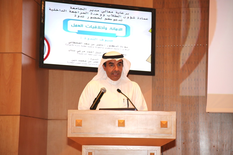 كما أشار إلى أن من صور الأمانة في البيئة الجامعية تطبيق العدل من جميع إدارات الجامعة ومنسوبيها مع الطلاب من حيث تكافؤ الفرص وتساويها مع الطلاب، في جميع التعاملات الجامعية، ابتداء من الكليات ثم العمادات المساندة ثم إدارة الجامعة، وبين أن من أشكال الأمانة أداء عضو هيئة التدريس واجبه التدريسي الأكاديمي بكل متطلباته ، ووضع الأسئلة التي تقيس مستوى الطلبة مقياساً صحيحاً سليماً.