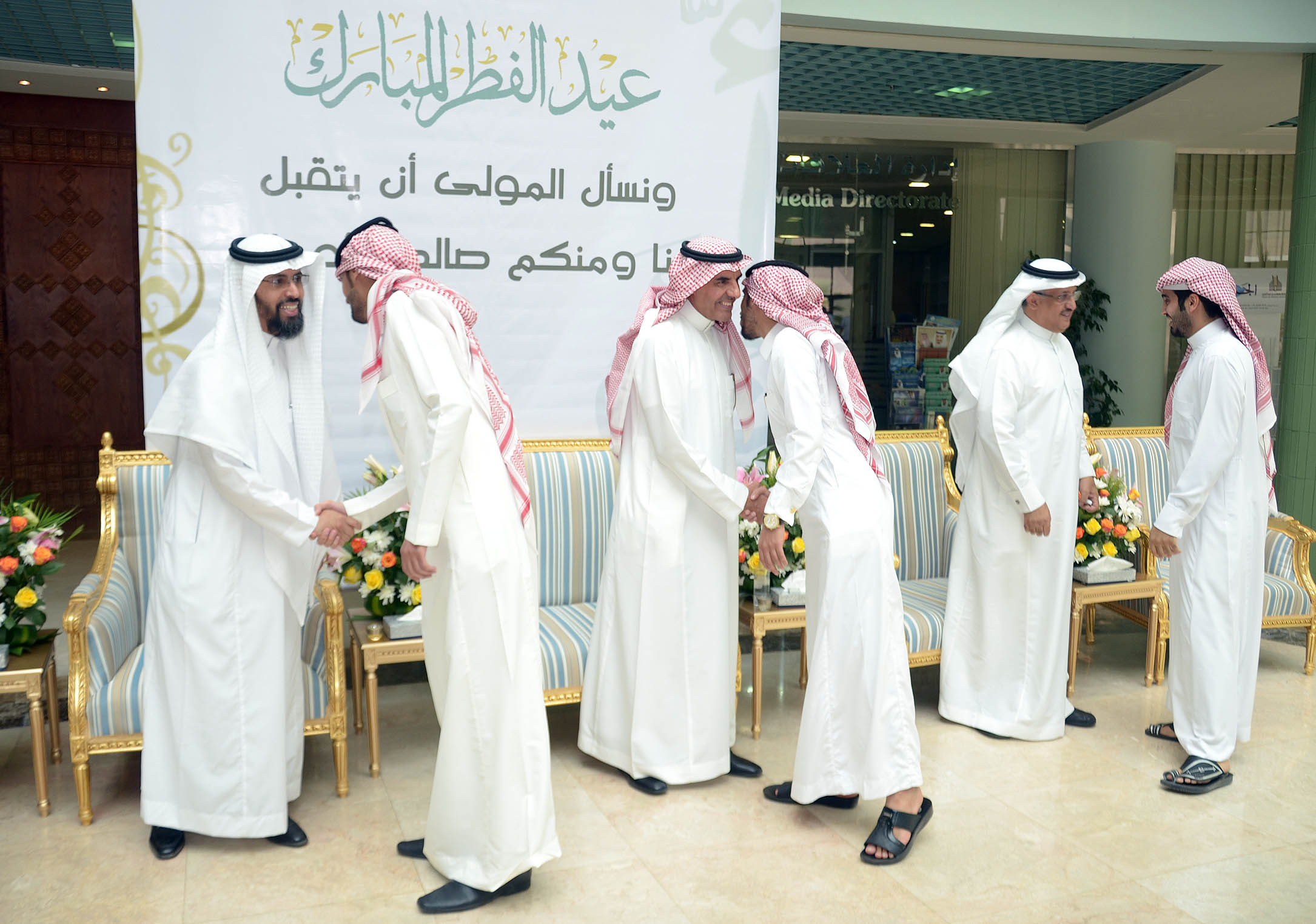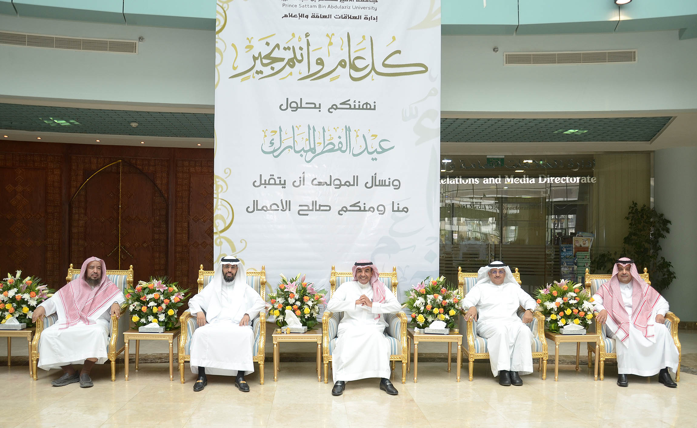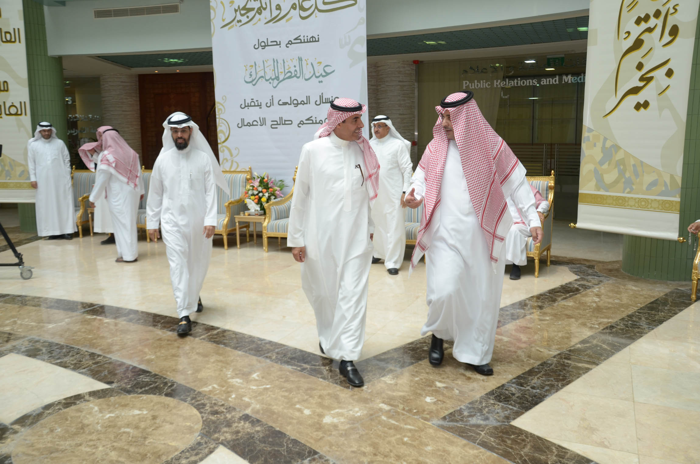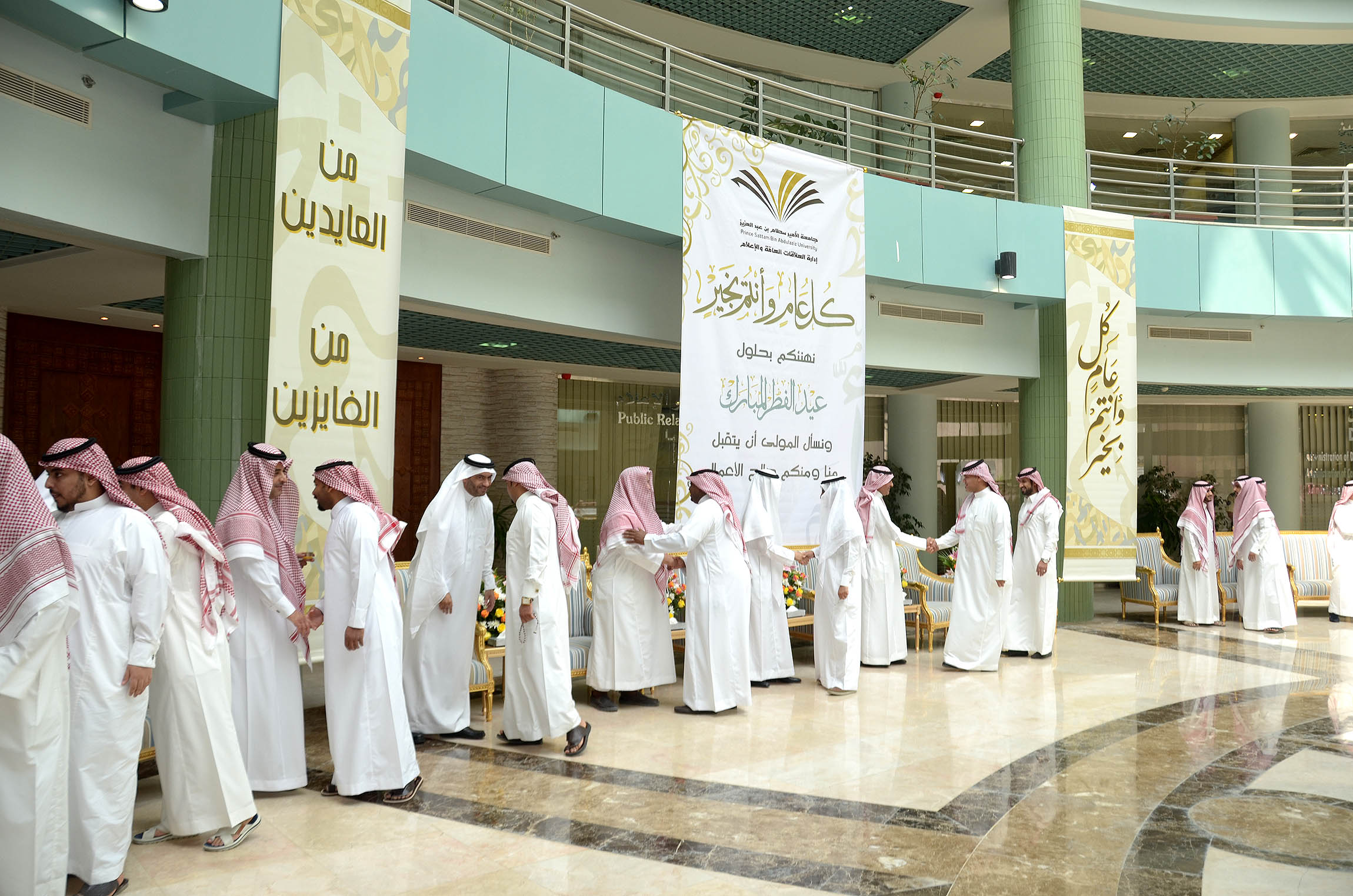 نظمت إدارة العلاقات العامة والإعلام بالجامعة احتفالاً بعيد الفطر المبارك بالمدينة الجامعية صباح اليوم الاثنين السادس من شهر شوال, وذلك بحضور معالي مدير الجامعة الدكتور عبد الرحمن العاصمي ووكلاء الجامعة وعمداء الكليات والعمادات المساندة وأعضاء هيئة التدريس وموظفي الجامعة وقدم الدكتور العاصمي التهاني لكافة منسوبي الجامعة بهذه المناسبة السعيدة وذكر أن الجامعة تحرص على إقامة هذا الحفل كل عام لتعزيز العلاقات الاجتماعية بين موظفيها وحتى يتسنى كذلك لكافة الموظفين تبادل التهاني بهذه المناسبة المباركة