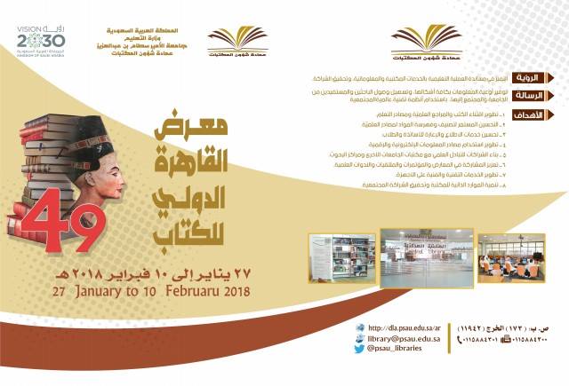 تشارك جامعة الأمير سطّام بن عبد العزيز - ممثلة في عمادة شؤون المكتبات وبرعاية معالي مدير الجامعة الأستاذ الدكتور عبد العزيز بن عبد الله الحامد- في فعاليات معرض القاهرة الدولي للكتاب في دورته التاسعة والأربعين، والمنعقد في أرض المعارض بمدينة نصر بالقاهرة في الفترة من 27 يناير إلى 10 فبراير.