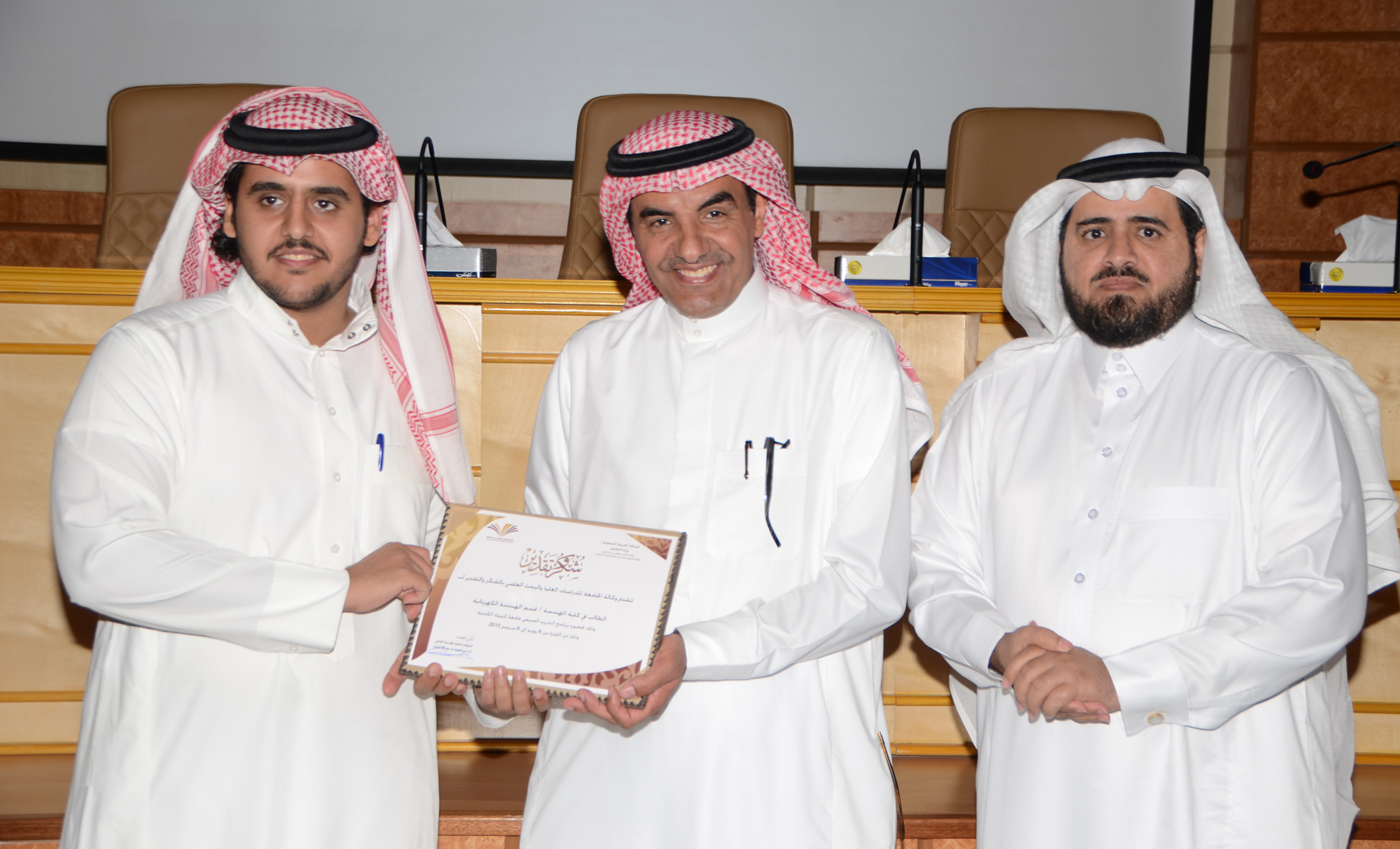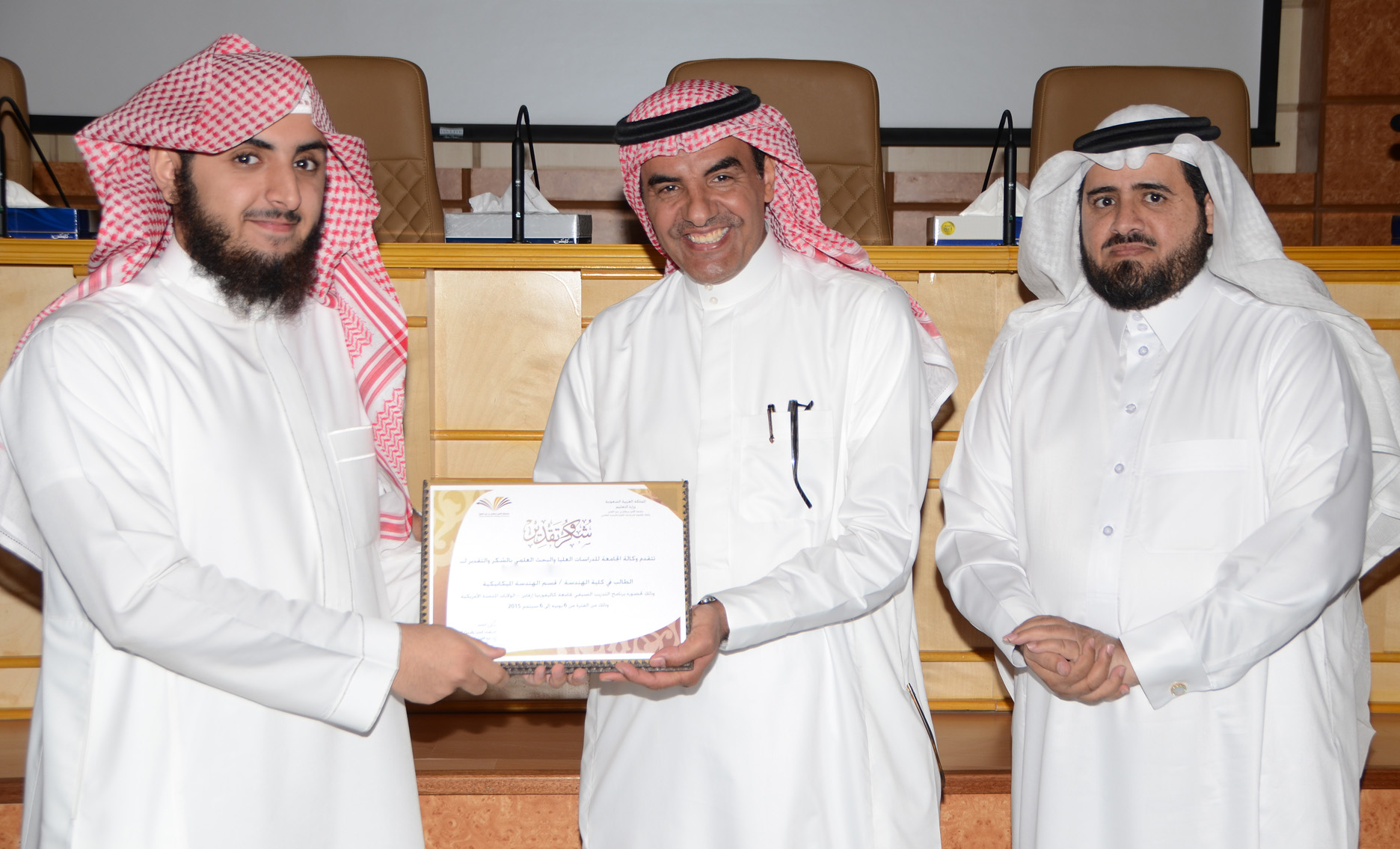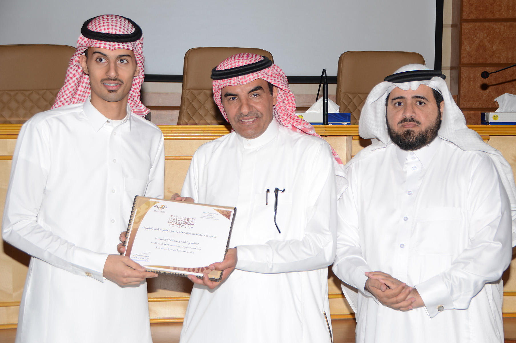 وفي نهاية الحفل الخطابي كرم معاليه عميد كلية الهندسة السابق الدكتور أسامة بن سعد آل ظافر على ما بذل من جهد منذ أن كان وكيلاً لكلية الهندسة ثم عميدًا لها، بعدها كرم معاليه الوفد الزائر من جامعة كاليفورنيا إرفاين والطلاب المشاركين في برنامج التعاون الدولي.
