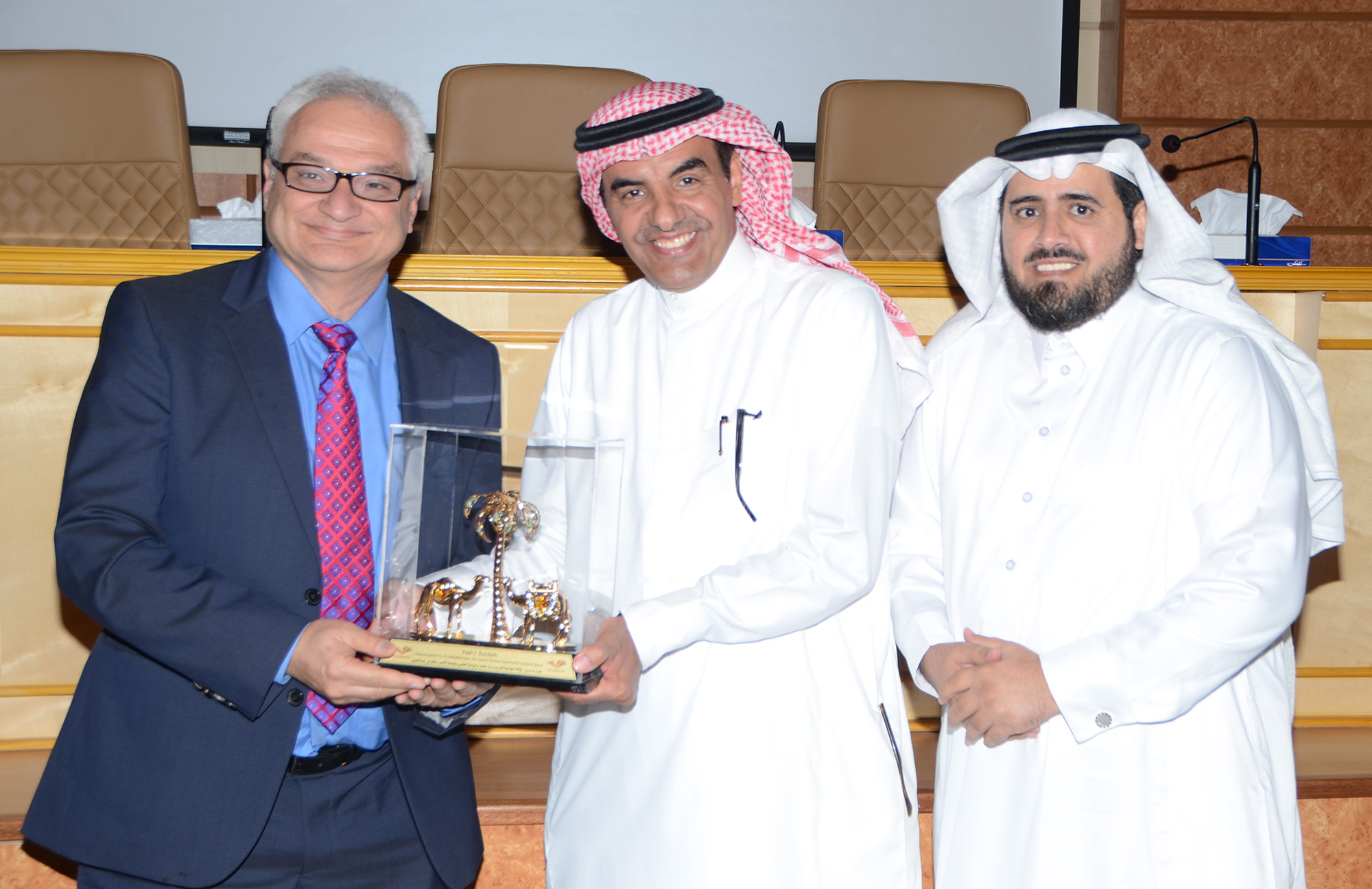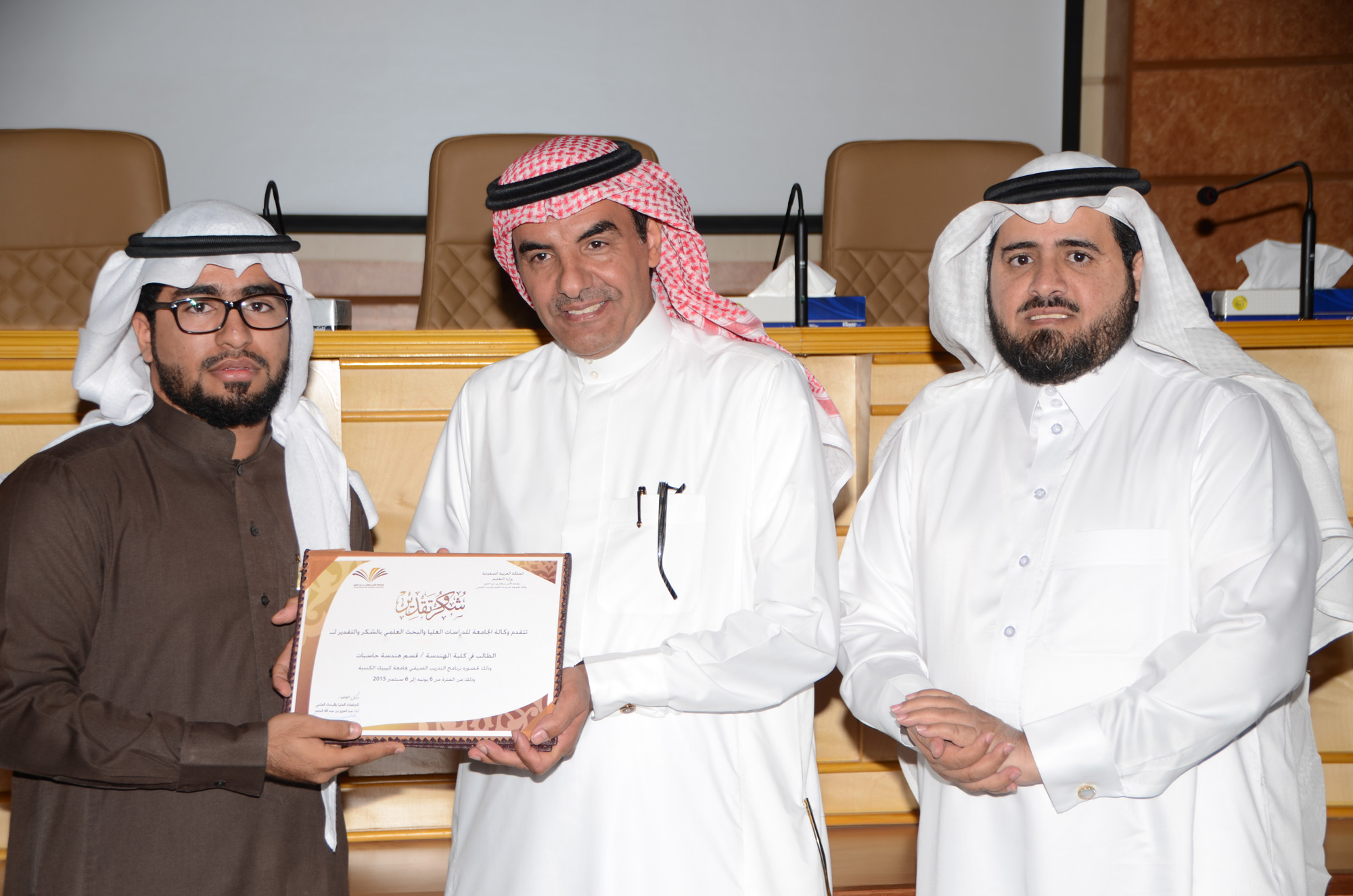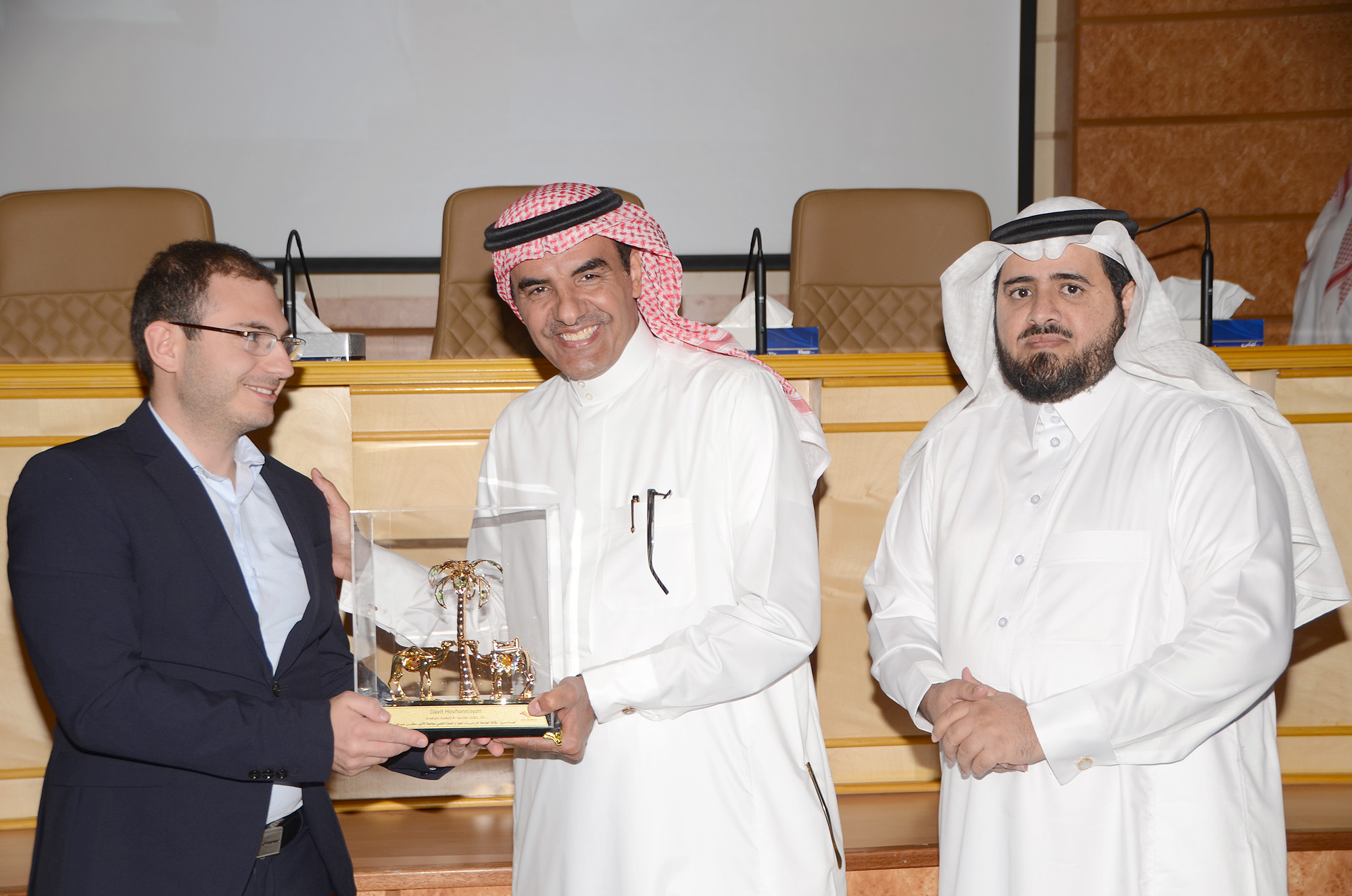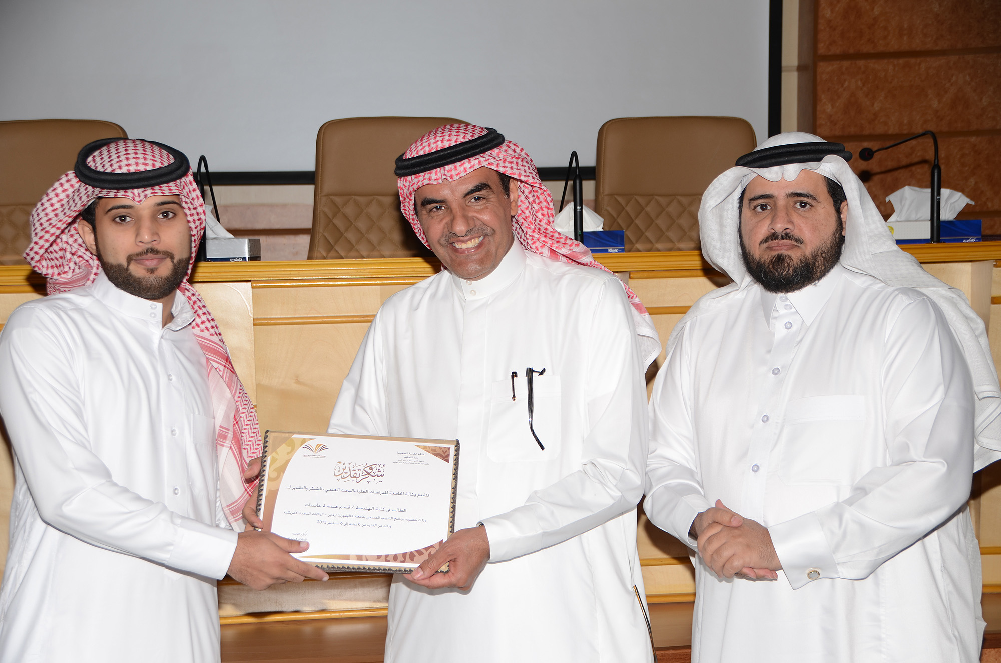 وفي نهاية الحفل الخطابي كرم معاليه عميد كلية الهندسة السابق الدكتور أسامة بن سعد آل ظافر على ما بذل من جهد منذ أن كان وكيلاً لكلية الهندسة ثم عميدًا لها، بعدها كرم معاليه الوفد الزائر من جامعة كاليفورنيا إرفاين والطلاب المشاركين في برنامج التعاون الدولي.