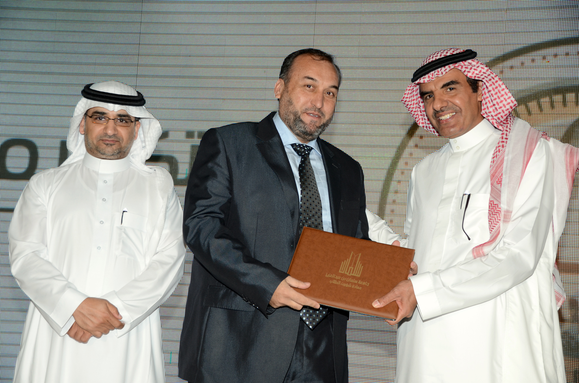 وفي نهاية الحفل سلم معاليه درعاً تذكارياً مقدم من عمادة شؤون الطلاب لوكيل الجامعة للتطوير والجودة الاستاذ الدكتور صالح القحطاني ولرئيس نادي الشعلة الاستاذ فهد الطفيل نظير ما قدموه للعمادة من دعم لإنجاح فعالياتها وأنشطتها المختلفة خلال الفترة المنصرمة.