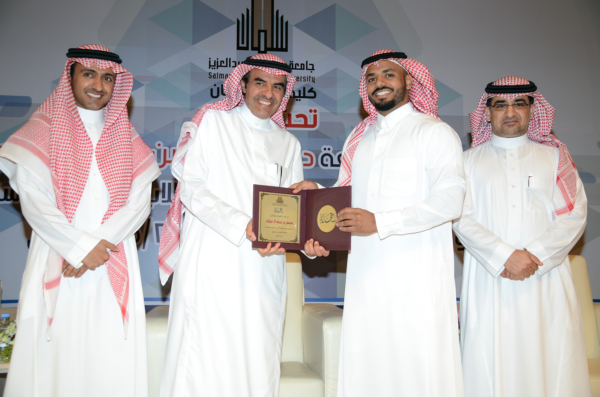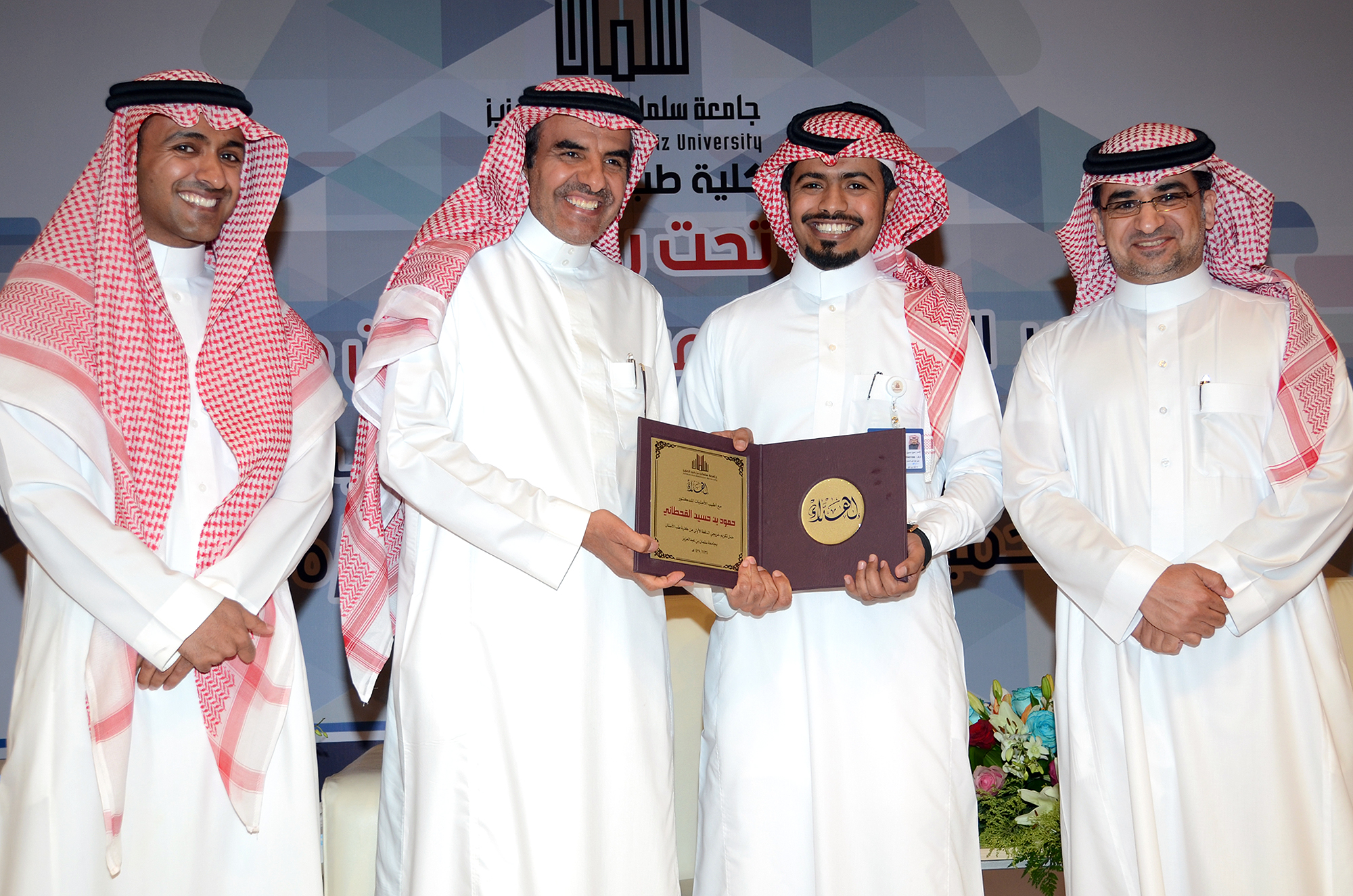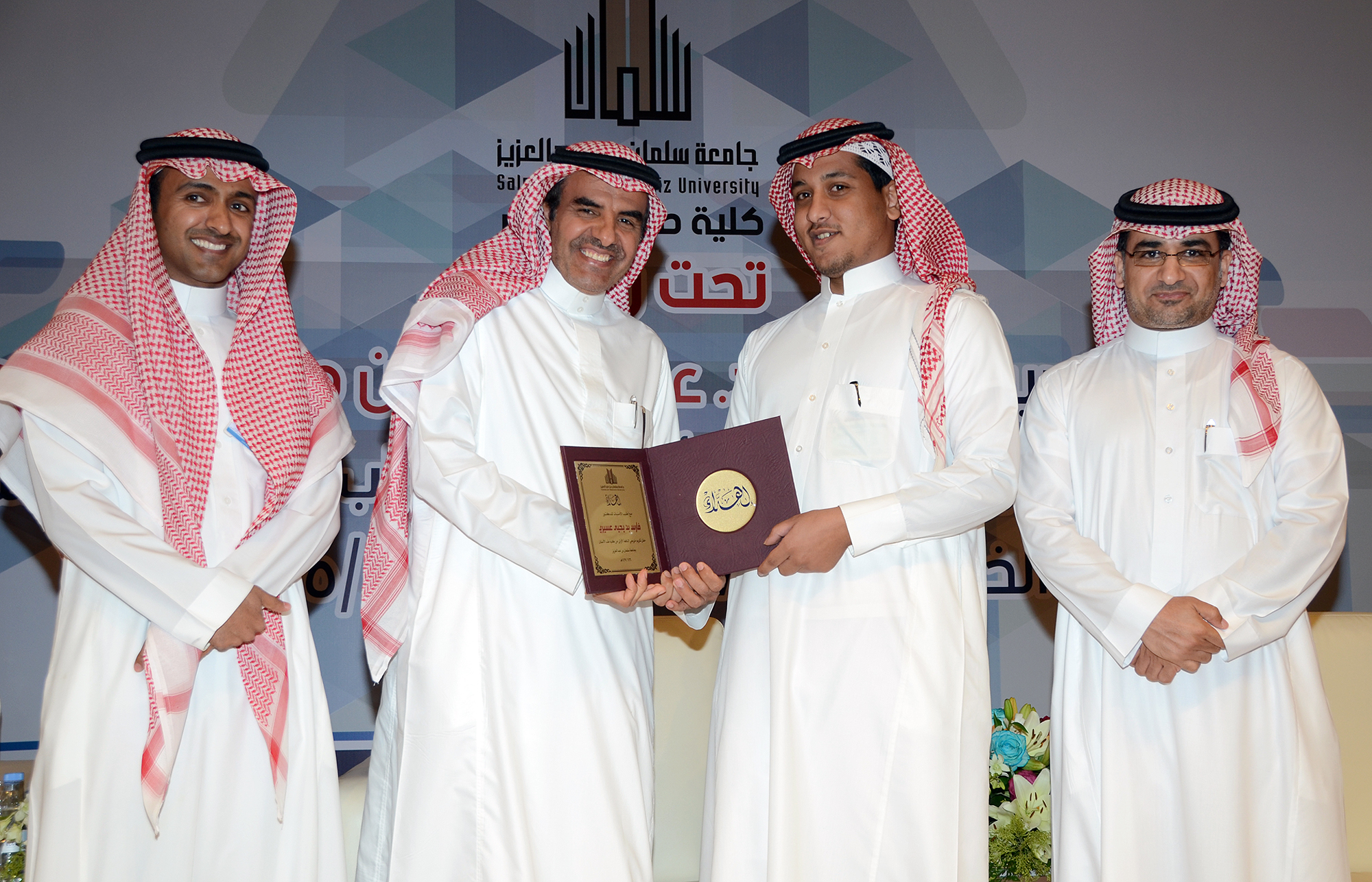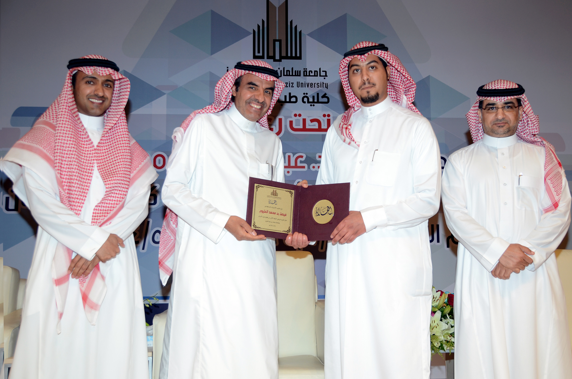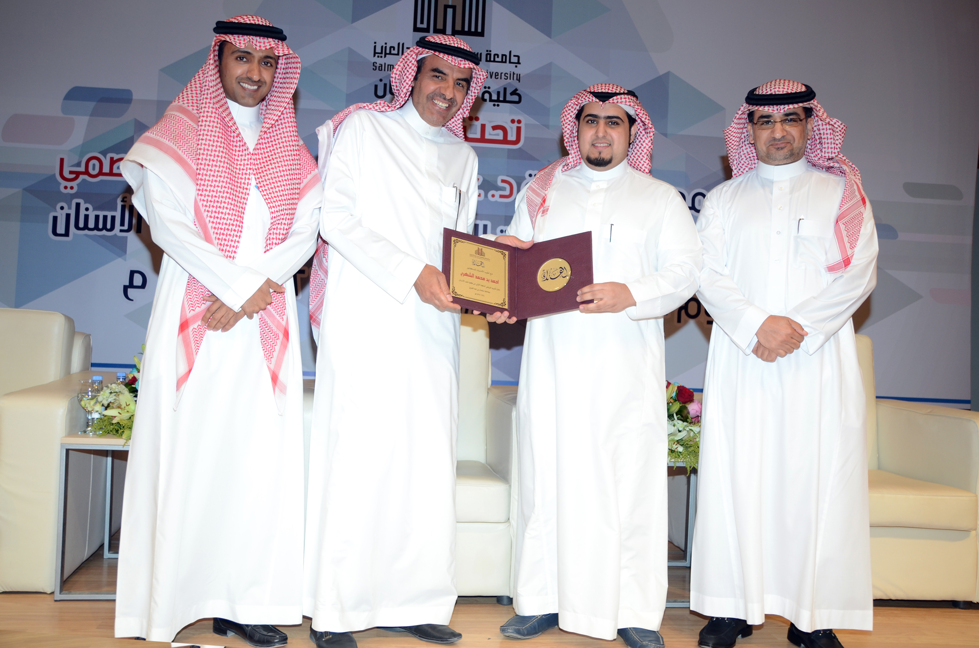 إدارة العلاقات العامة والإعلام رعى معالي مدير جامعة سلمان بن عبد العزيز الدكتور عبد الرحمن بن محمد العاصمي حفل تكريم خريجي الدفعة الأولى من طلاب كلية طب الأسنان، وحضر الحفل وكلاء الجامعة والعمداء وأعضاء هيئة التدريس والطلاب وأولياء أمور الطلاب الخريجين بمسرح المدينة الجامعية بالخرج، وبدأ الحفل بآيات من الذكر الحكيم تلتها كلمة الطلاب الخريجين ثم كلمة لعميد كلية طب الأسنان الدكتور نايف بن دايل بدأها في الترحيب بالضيوف واستعرض مراحل تأسيس الكلية وما يتوفر لدى الكلية من إمكانات كبيرة ساعدت على إيجاد بيئة تعليمية اكاديمية ساعدت على تجويد التعليم , وتزويد الطالب بالقدر الضروري من العلوم والمعارف والمهارات ,وذكر بن دايل أن هذا ما كان ليتم لولا توفيق الله ثم الدعم السخي الذي تتلقاه جميع الجامعات السعودية من حكومة خادم الحرمين - حفظه الله ورعاه – وقال: أننا وبدعم مباشر من معالي مدير الجمعة حرصنا كل الحرص على تجويد مخرجات الكلية من خلال توفير أعضاء هيئة التدريس المتميزين والمعامل المجهزة بتقنية عالية ونحن في هذا اليوم الذي نعده بداية ننطلق من خلالها لإعادة التقييم لعملية تطوير مستمرة لبرنامج البكالوريوس وبرنامج تدريب الامتياز ومن ثم فتح أبواب الدراسات العليا.
