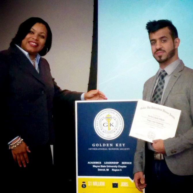 منحت جامعة وين الحكومية الأمريكية جائزة عضوية المفتاح الذهبي العالمية الفخرية لعام2014 للطالب السعودي مشعل بن غالب الحربي طالب في كلية الهندسة تخصص علوم الحاسب والمبتعث من جامعىة