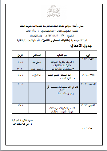 تستعد كلية التربية بالدلم بإقامة برنامج لتهيئة طالبات التربية الميدانية من خلال جدول أعمال الفئة المستهدفة طالبات المستوى الثامن من جميع الأقسام التعليمية للفصل الدراسي الأول للعام الجامعي : 1436/1437هـ يبدأ البرنامج يوم الاثنين الموافق 1436/11/9هـ ويستمر البرنامج لمدة أربعة أيام، بقاعة الخنساء تحت أشراف الدكتورة منى طه مشرفة التربية الميدانية .