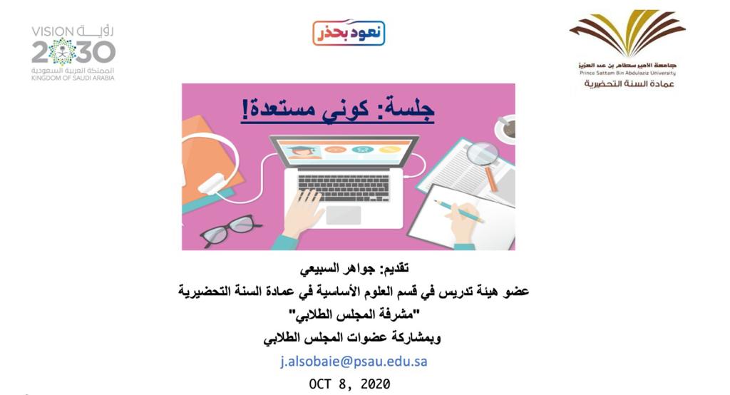 عقد المجلس الطلابي في عمادة السنة التحضيرية قسم الطالبات جلسة بعنوان (كوني مستعدة!) عبر برنامج زوم يوم الأثنين الموافق ١٤٤١/٢/٢٥ هـ ، في تمام الساعة ٧مساءً بإشراف الأستاذة جواهر السبيعي وبمساعدة عضوات المجلس.