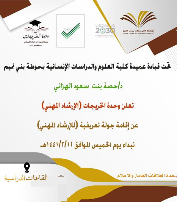 في خضم برامج التوعية لطالبات كلية العلوم والدراسات الإنسانية بحوطة بني تميم و تحت قيادة عميدة الكلية د. حصة بنت سعود الهزاني ، نظّمت وحدة الخريجات جولة تعريفية بالإرشاد المهني بدأت في يوم الأحد الموافق 11 / 2/ 1441هـ استمرت الجولة أربعة أيام. هدفت الجولة إلى توعية الطالبات المستجدات بكيفية اختيار التخصص المناسب ، واكتشاف الذات، و التعرف علي الميول ، و نشر ثقافة الإرشاد المهني، و تبصير الطالبات بمهن المستقبل والوظائف المتاحة في سوق العمل. وجدت الجولة استحسان من الطالبات وتفاعل بينهن، كما طُرحت بعض الأفكار من قبل الطالبات.