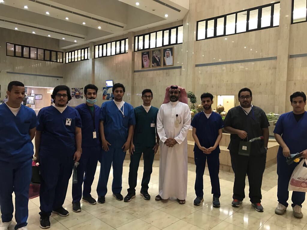 ضمن برامج حملة " كن متطوعاً تكن سعيداً" في نسختها الخامسة التي دشنها عميد شؤون الطلاب الدكتور ثلاب الشكرة غرة شهر رمضان المبارك لعام 1438هـ , قام أعضاء نادي العلاج الطبيعي بكلية العلوم الطبية التطبيقية التابع لعمادة شؤون الطلاب بزيارة المرضى المنومين بمدينة الملك فهد الطبية في مدينة الرياض اليوم السبت 23 / 9 /1438هـ , حيث قدم أعضاء النادي بعض الهدايا العينية للمنومين وإدخال السعادة على قلوبهم , وكذلك بعض النصائح الطبية وبعض التمارين لتحريك أعضاء الجسم وعدم إهمالها والتي تعوض عن قلت الحركة.