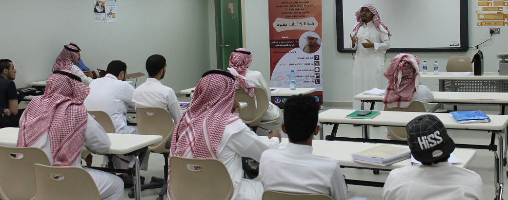 نظمت لجنة الأنشطة الطلابية بكلية إدارة الأعمال بالتعاون مع وحدة التوعية الفكرية بالجامعة ضمن مشروع (نحو جامعة واعية-1) محاضرة تثقيفية بعنوان " خذ الكتاب بقوة " ، قدمها سعادة الدكتور محمد بن مقبل بن ناصر المقبل ، عضو هيئة التدريس بكلية التربية . والتي استعرض خلالها أهمية الثقة والإيمان في نصرة الله لدينه وللمسلمين الملتزمين بتعاليم شرعه الحنيف وضرورة تصحيح العقيدة وإخلاصها للمولى عز وجل والثبات على المبادئ الإسلامية القويمة مهما تغيرت الظروف المحيطة بالشاب المسلم وعدم الانسياق وراء النفس وشهواتها أو المغريات المحيطة بل مواجهتها بمزيد من العلم والتعلم ومصاحبة الصالحين ومجاهدة النفس تحقيقاً لمعنى العبودية الحق لله تعالى .