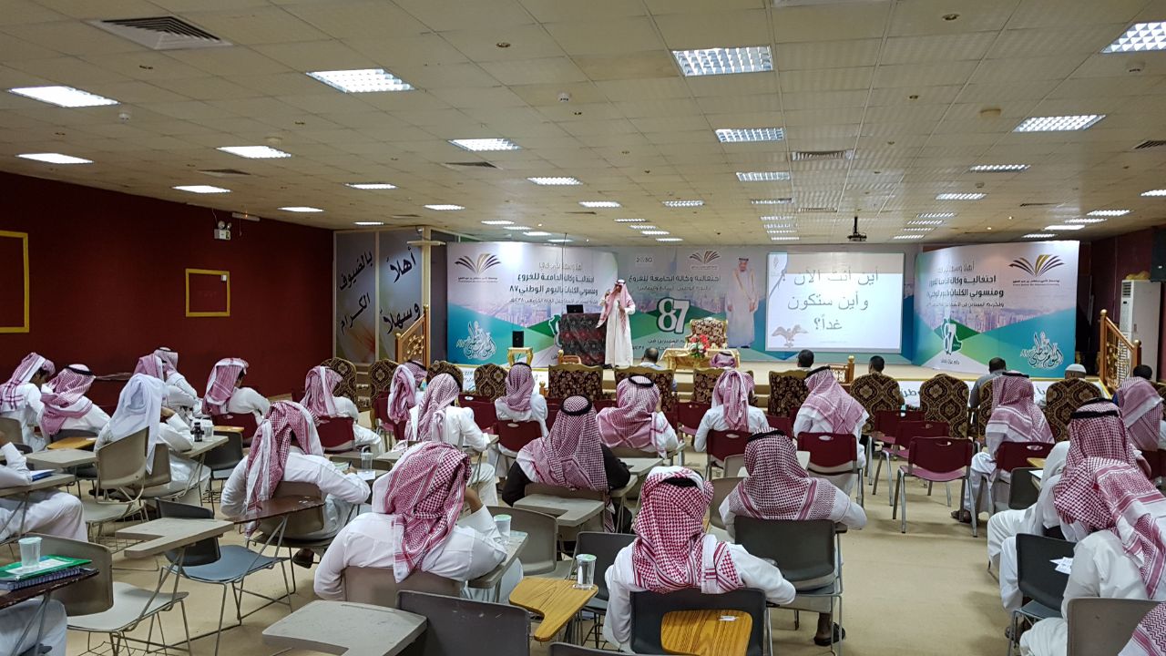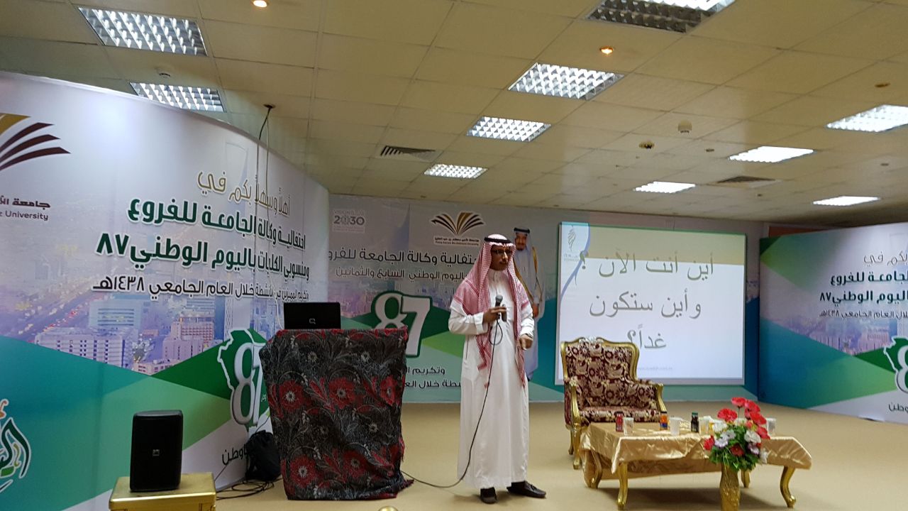 وأقيمت بعدها المحاضرة بتنظيم وحدة الخريجين بإشراف مدير الوحدة الأستاذ فراج بن سعد الشهراني ، بدا خلالها الدوسري بالترحيب بالطلاب والحضور من أعضاء هيئة التدريس ثم شرع بعد ذلك بالتعريف عن برنامج (ريادة ) وأنه تنظيم وطني مؤسسي مستقل غير ربحي أُسس بمبادرة من وزارة البترول والثروة المعدنية والمؤسسة العامة للتدريب التقني والمهني تحت مسمى : (مركز المنشآت الصغير) ثم تم نقل جميع الامكانيات إلى معهد ريادة الأعمال الوطني بعد الهيكلة .