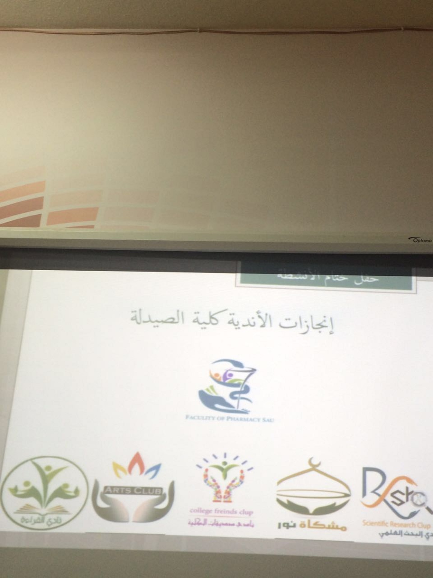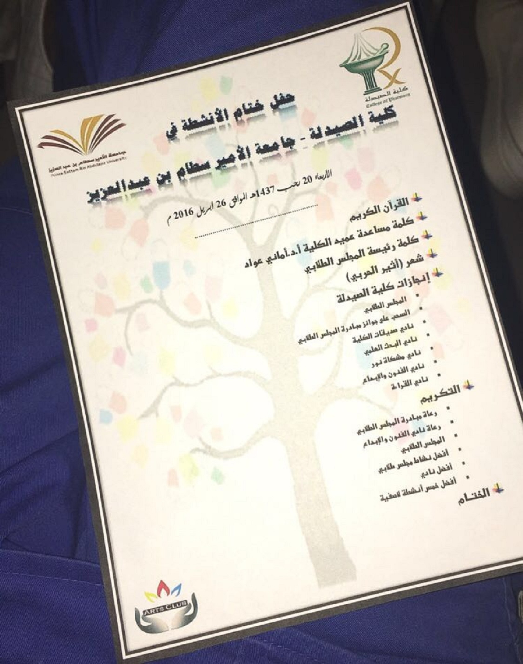 نَظم المجلس الطلابي بكلية الصيدلة شطر الطالبات حفل ختام الأنشطة الطلابية للعام الجامعي (1436/1437ه) يوم الاربعاء الموافق 20-7-1437ه بحضور مساعدة عميد الكلية أ.د. أماني عواد ومنسوبات الكلية من أعضاء الهيئة التعليمية والإدارية والطالبات والضيوف الرعاة لأنشطة الكلية من خارج الجامعة وبدأ الحفل بتلاوة عطرة من كتاب الله الكريم، ومن ثم كلمة مساعدة العميد لشطر الطالبات أ.د. أماني عواد حيث قالت أن هذا اليوم هو حصاد عام كامل وأن ما وصلت إليه طالباتنا من إنجازات هو فخر لجامعة سطام ثم تلى ذلك النشيد الوطني للملكة العربية السعودية ثم أبيات شعرية ألقتها الطالبة:أثير الحربي تلى ذلك كلمة المجلس الطلابي ألقتها الطالبه:هيا الكنهل